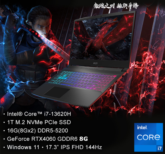 搭載 Intel® Core™ i7-13620H 處理器 搭載GeForce RTX™ 4060 8GB GDDR6筆記型電腦GPU 支援NVIDIA DLSS 3,超高效Ada Lovelace架構及Max-Q 技術 Win11 文書 影音軟體 YT去廣告 原廠兩年保固