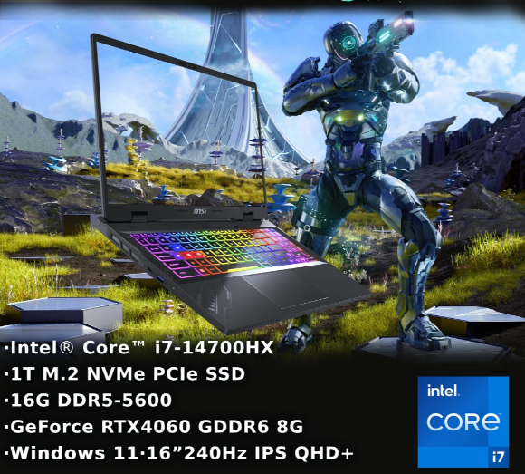 搭載 Intel® Core™ i7 處理器 14700HX 16吋QHD+ (2560x1600), 16:10, 240Hz更新率 100% DCI-P3, IPS等級電競面板 Win11 文書 影音軟體 YT去廣告 原廠兩年保固