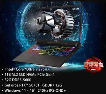 搭載 Intel® Core™ Ultra 9 處理器 275HX 搭載 NVIDIA® GeForce RTX™ 5070Ti 筆記型電腦 NVIDIA® GPU 12GB GDDR7 16吋QHD+ (2560x1600), 240Hz更新率, IPS等級面板 Win11 文書 影音軟體 YT去廣告 原廠兩年保固