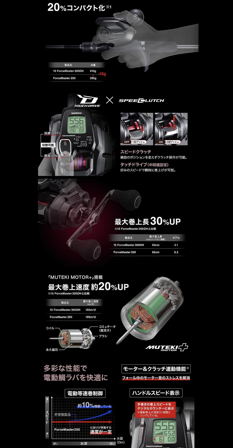 SHIMANO Force Master 200 電動捲線器 手持電捲 FM200 電捲 SHIMANO FORCE MASTER200電動捲線器 令人嘖嘖稱奇的精巧機身 白帶 花軟 魚皮鉤 手持透抽最適用.手持時輕鬆晃餌 為了提升單手握持操作性,將側蓋面積精巧化20%※1,同時成功實現輕量化,電源座則變更配置於握把側,實現握持手舒適穩定包覆握持。搭載新增中間速設定機能的TOUCH DRIVE,以及線杯控線同時可切換ON﹧OFF的SPEED離合器,更透過手把轉一圈超過60cm的高齒輪比配置,手動捲收演出 魅惑節奏的誘魚操作與捲動作合,成功提升收線揚竿性能。加上MUTEKI+馬達助攻,達到釣組高速捲收,並實現高速零負擔的手持電捲釣體驗。 主要適用於頻繁操作的輕型船釣、白帶魚、花軟、魚皮鉤(SABIKI)、手持透抽等,其中針對電動鯛魚頭釣,更精心搭載近乎完美展現等速收線操作的“電動等速收線機制”、釣組下沉時馬達達到靜音狀態的“馬達&離合器連動機能”,以及可確實掌握並重現中魚當下手動捲收速度的“手把速度顯示”機能,不僅如此,“迷宮機身構造”設計,即使選用0.8號PE線也能有效防止纏線困擾,安心輔助釣魚人作釣。 令人嘖嘖稱奇的袖珍精巧機種,引領您探訪全新電動船釣領域。 ■ CI4+ ■ NEW TOUCH DRIVE ■ SPEED CLUTCH離合器 ■ MUTEKI MOTOR+ ■ 海底.魚群水深顯示 ■ S精巧機身 ■ 樂速模式﹧定速模式 ■ 高解晰LCD ■ 探見丸無線通信 ■ 散熱系統 ■ FIRE MACH SYSTEM ■ 碳纖十字墊片 ■ e-EXCITING DRAG SOUND(咬餌告示音) ■ 語言介面(日文/英文) ■ 晃餌設定 ■ 暫時停止按鈕 ■ 誘魚機能 ■ 釣棚記錄機能 ■ 釣棚計時機能 ■ 捲線學習修正 ■ 釣線出線速度顯示 ■ 電動收線負重顯示 ■ 釣組回收時間顯示 ■ 從上開始/從底開始 ■ 超微變速機制 ■ 電動等速收線機制 ■ 手把速度顯示 ■ 馬達&離合器連動機能 ■ 電動超慢速收線