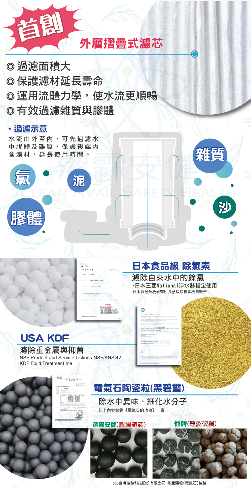 ▪ 首創摺疊濾心.過濾雜質.膠體.過濾面積大 ▪ 有效去除水中餘氯.重金屬.異味 ▪ DIY安裝簡單.濾心更換方便 ▪ 日本食品級濾材.USA KDF.電氣石