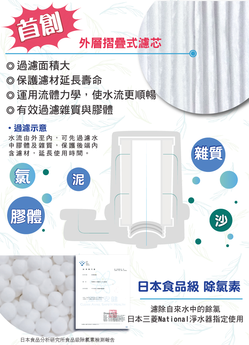 ▪ 首創摺疊濾心.過濾雜質.膠體.過濾面積大 ▪ 有效去除水中餘氯 ▪ 具多項專利研發 ▪ 通過多項檢測報告 ▪ DIY安裝簡單.濾心更換方便 台灣研發生產製造品質安全有保證~ ▪ 日本食品級濾材 ▪ 投保5000萬產品責任險,使用安心有保障