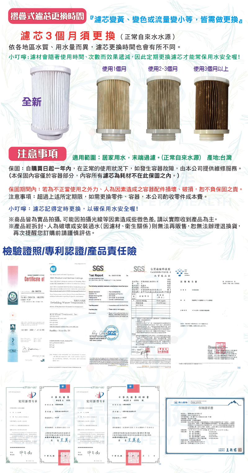 使用壽命:摺疊式濾芯3個月更換(水源:自來水水源),依各地區水質、用水量而異,濾芯更換時間也會有所不同。