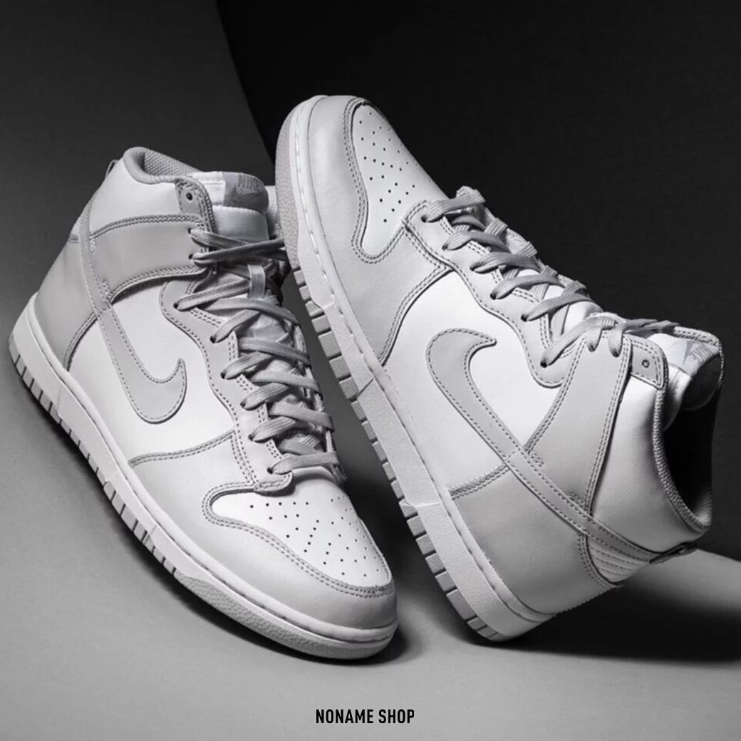 🔹整雙鞋採用白色皮革材質打造鞋身主體,搭配淺灰色鞋身框架,展現出 Nike Dunk High 這一鞋型的原貌