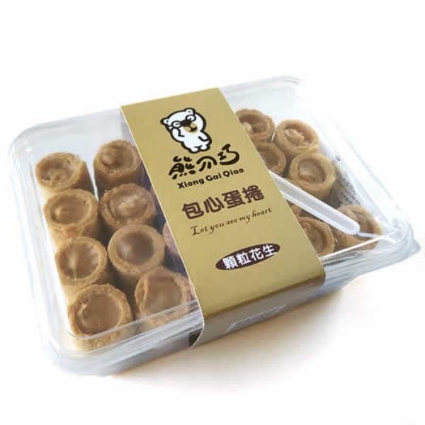 熊介巧-花生顆粒包心蛋捲 蛋捲愛餡-真心實在使用花生研磨 酥鬆的蛋捲包裹著內餡飽滿的花生醬 真蛋捲皮不加一滴水手工填入滿滿餡料