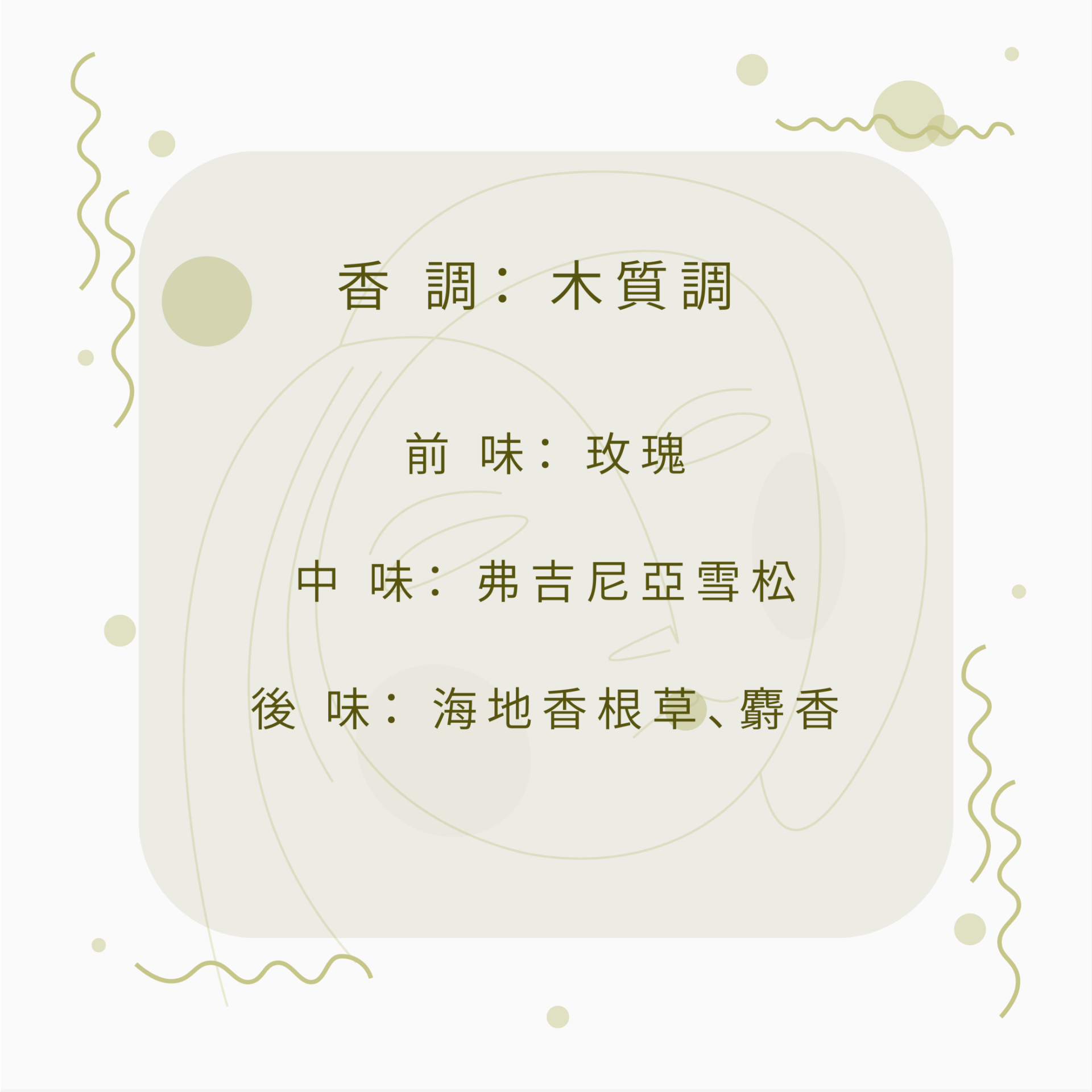 香 調: 木質調前 味: 玫瑰中 味: 弗吉尼亞雪松後 味: 海地香根草、麝香