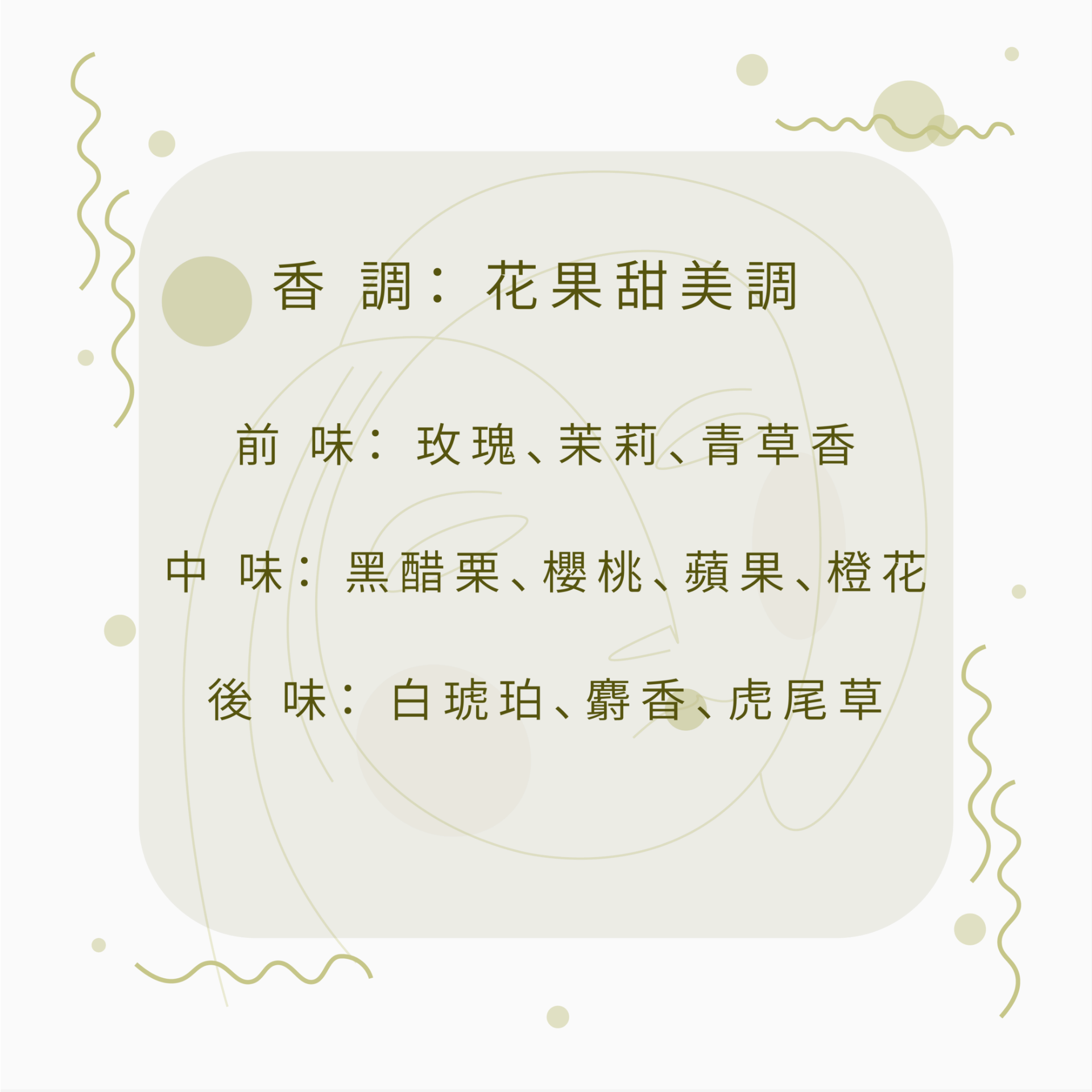 香調: 花果甜美調前味: 玫瑰、茉莉、青草香中味: 黑醋栗、櫻桃、蘋果、橙花後味: 白琥珀、麝香、虎尾草