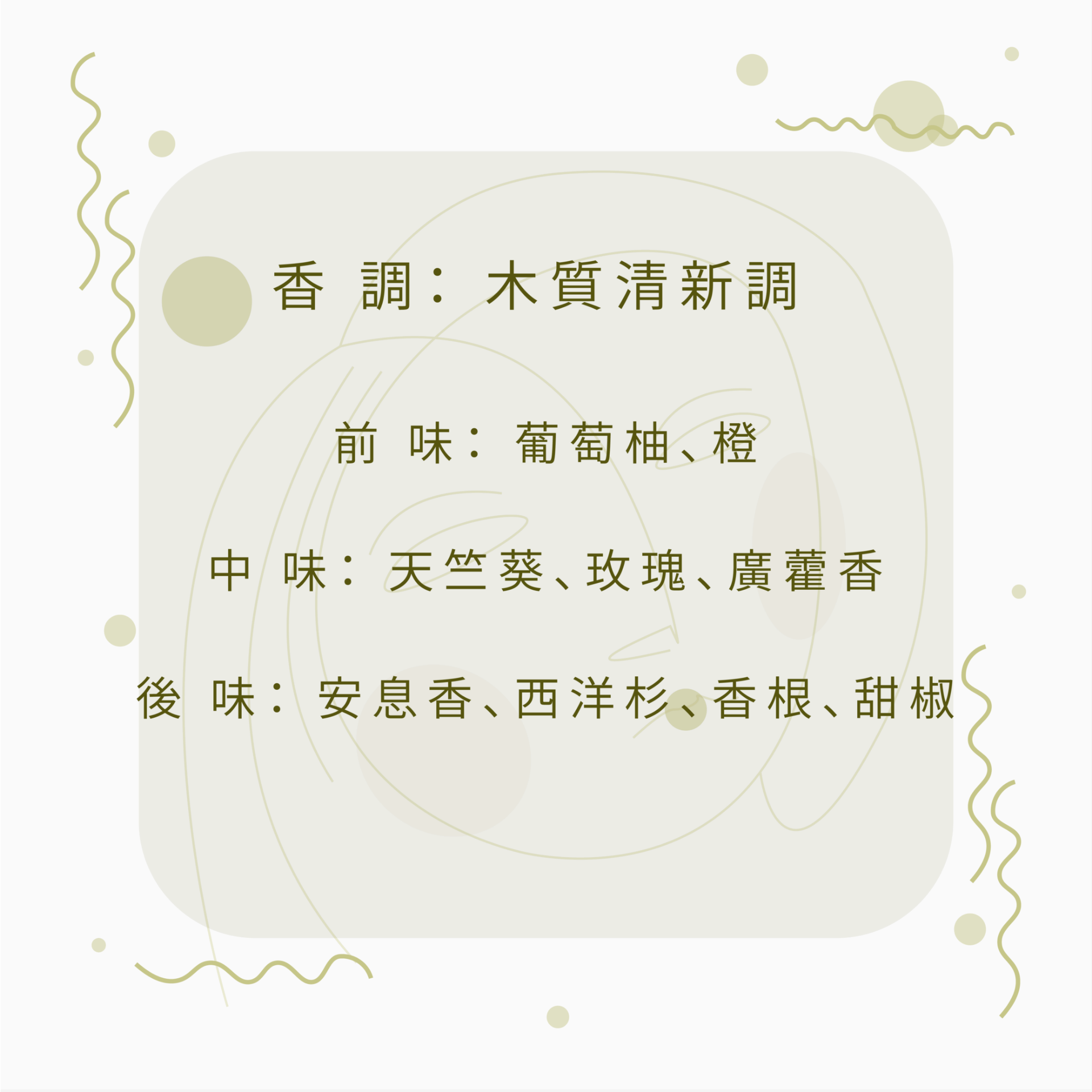 香調:木質清新香調前調:葡萄柚、橙中調:天竺葵、玫瑰、廣藿香後調:安息香、西洋杉、香根、甜椒
