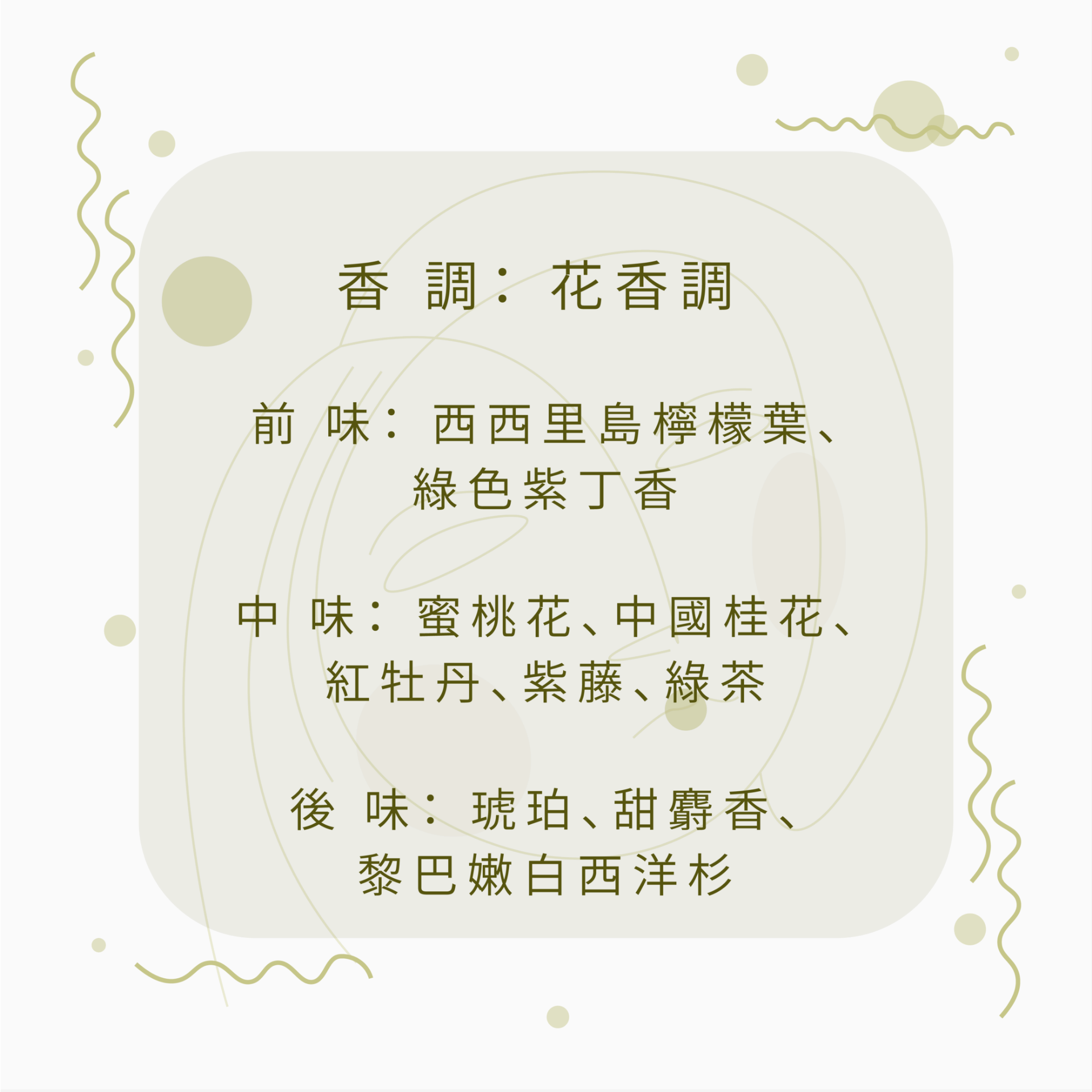 香調: 花香調前味: 西西里島檸檬葉、綠色紫丁香中味: 蜜桃花、中國桂花、紅牡丹、紫藤、綠茶後味: 琥珀、甜麝香、黎巴嫩白西洋杉