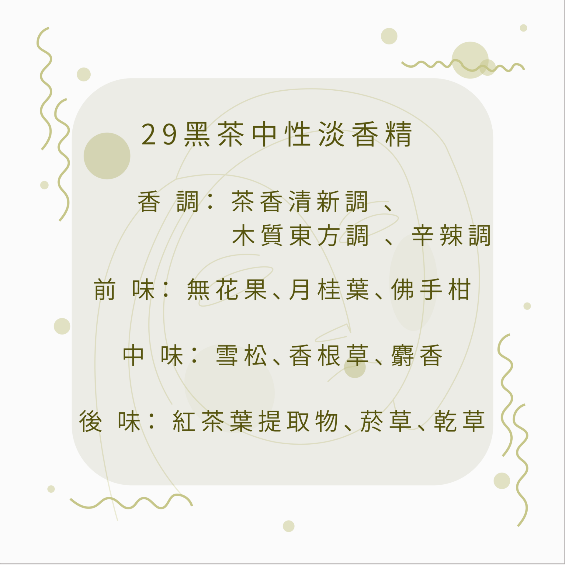 香調:茶香清新調、東方木質調、辛辣調