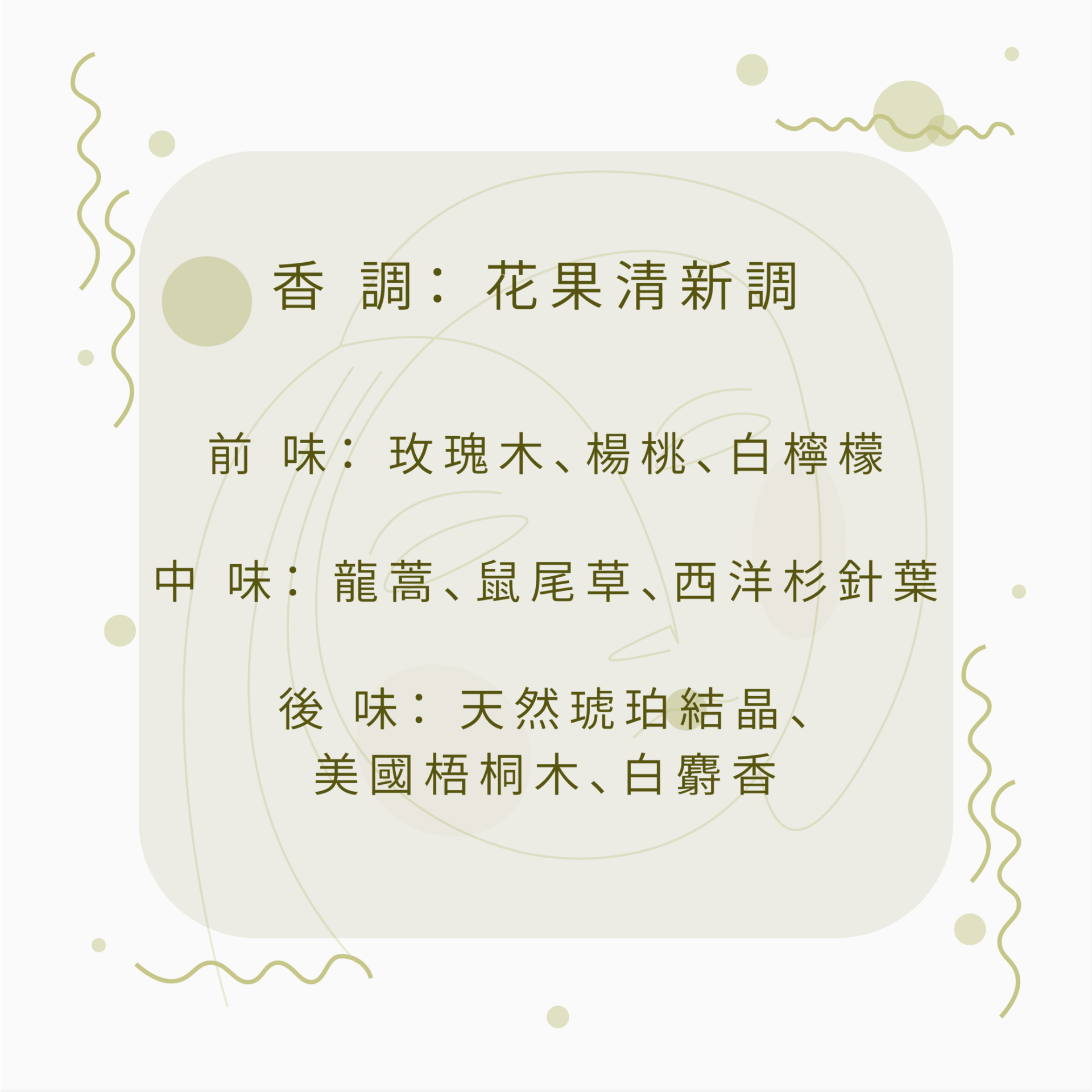 香調:花果清新調前調:玫瑰木、楊桃、白檸檬中調:龍蒿、鼠尾草、西洋杉針葉後調:天然琥珀結晶、美國梧桐木、白麝香