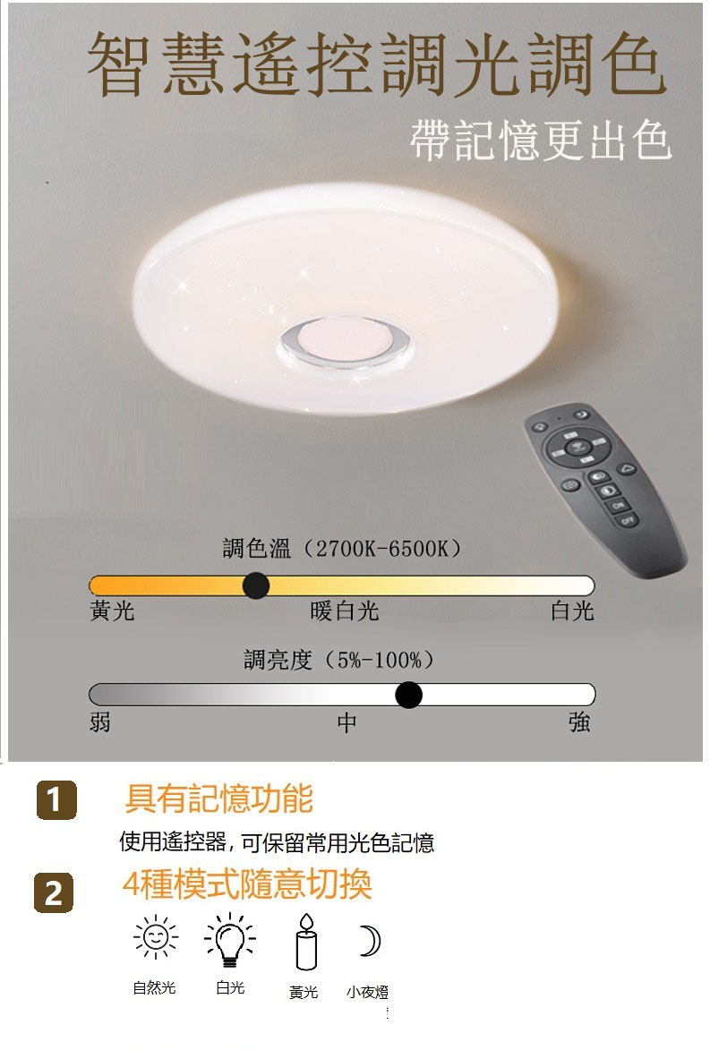 産品特色:1: 雙控開關(壁控&遙控) 2:自由切換、隨心調整”亮度”及”色溫” 質感經典燈罩,百搭室內裝潢 。 3 : 2.4G 髙靈敏遙控器 ,具有記憶功能,可存取合適色溫和亮度。