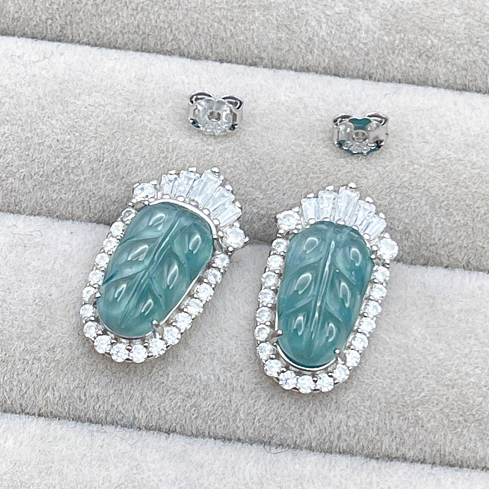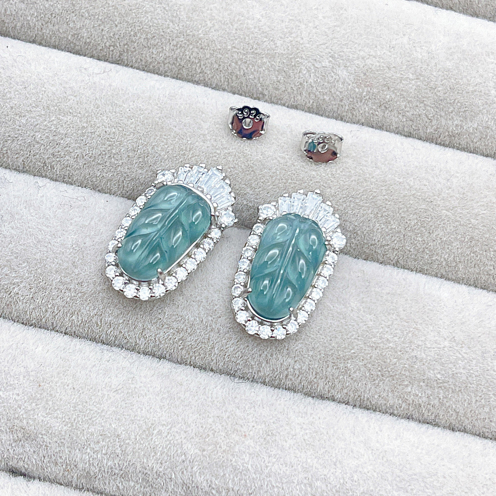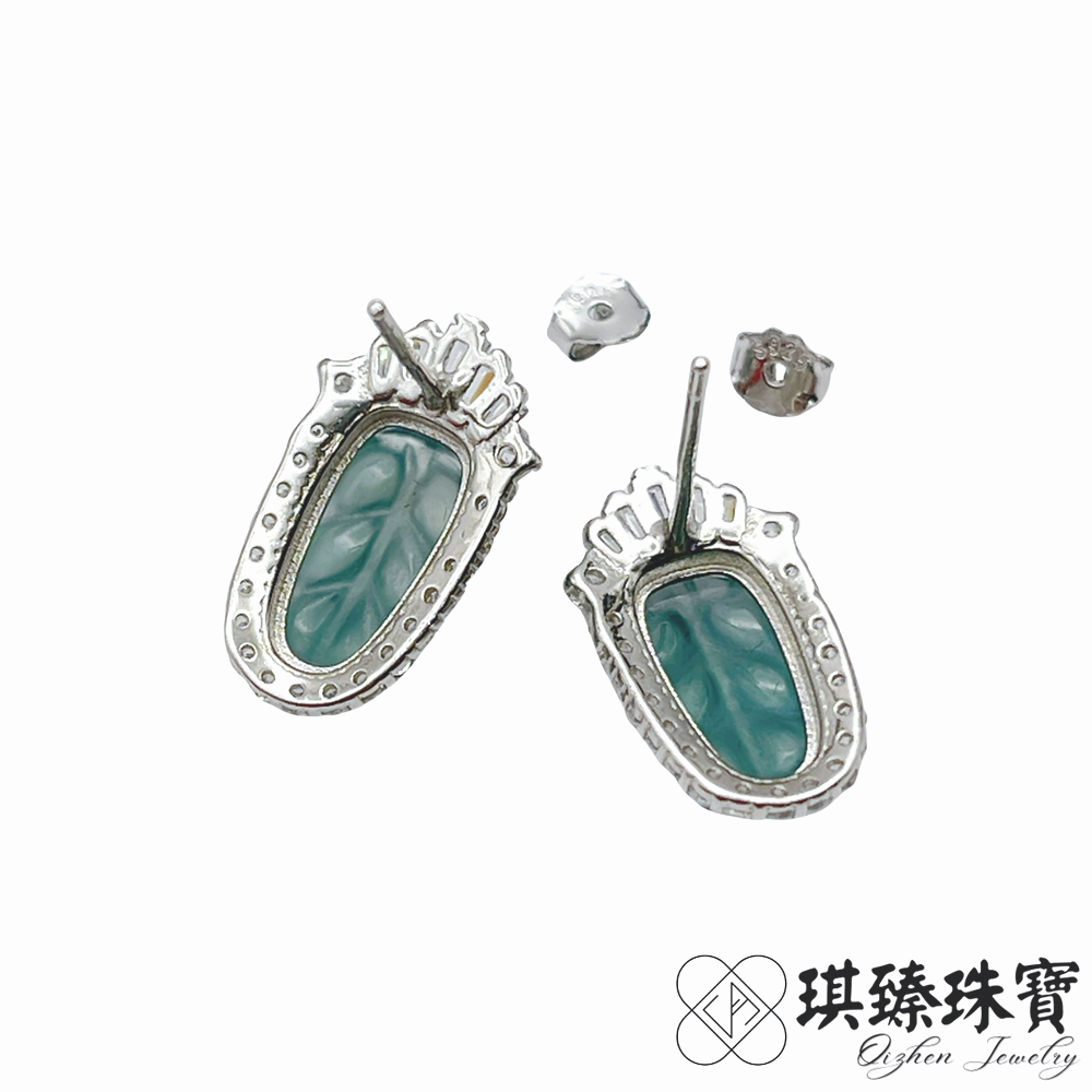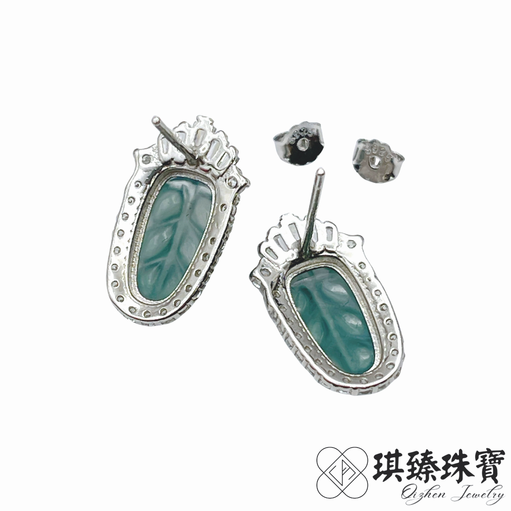 【琪臻珠寶】天然A貨翡翠冰種藍水葉子造型耳環耳釘(S925銀鑲_翡翠耳環_頂級豪華款)