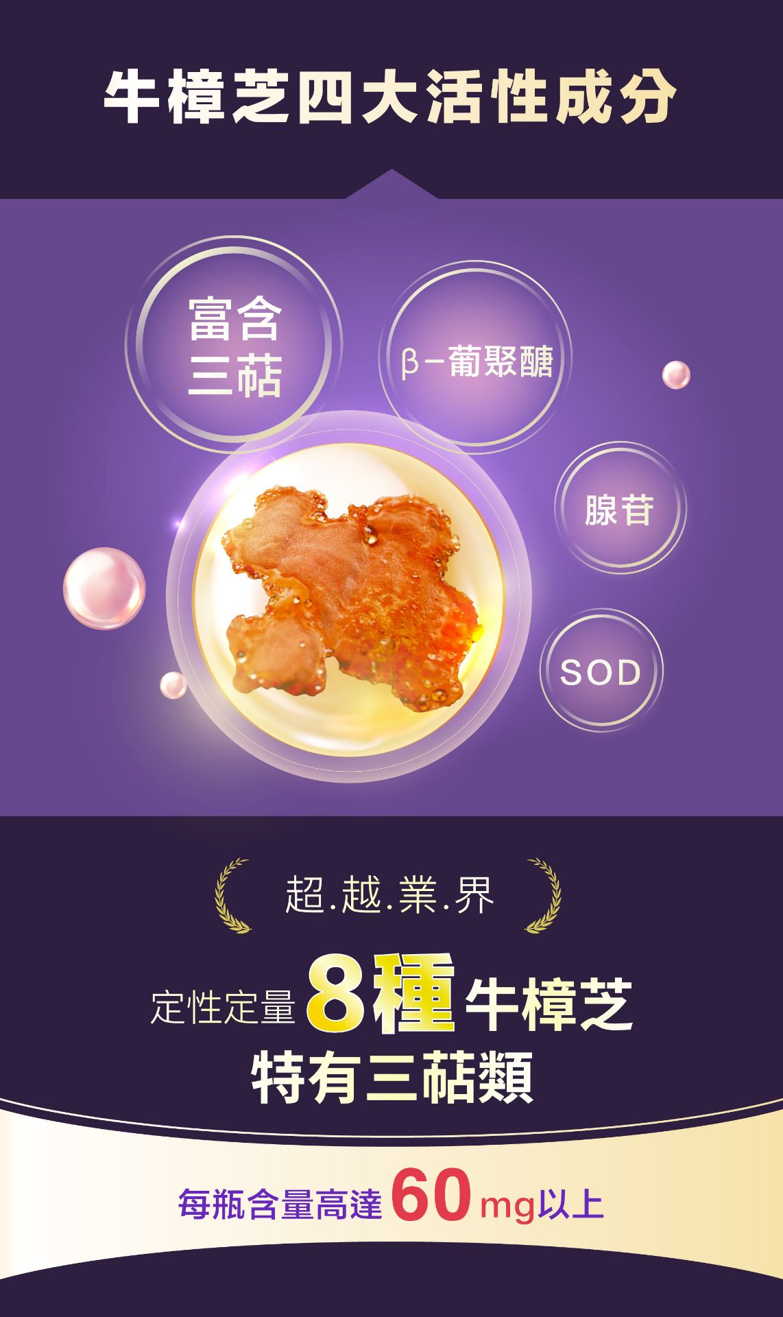 內  容  物:食用級聚乙二醇(PEG)、牛樟段木栽培牛樟芝(Taiwanofungus camphoratus)子實體萃取物