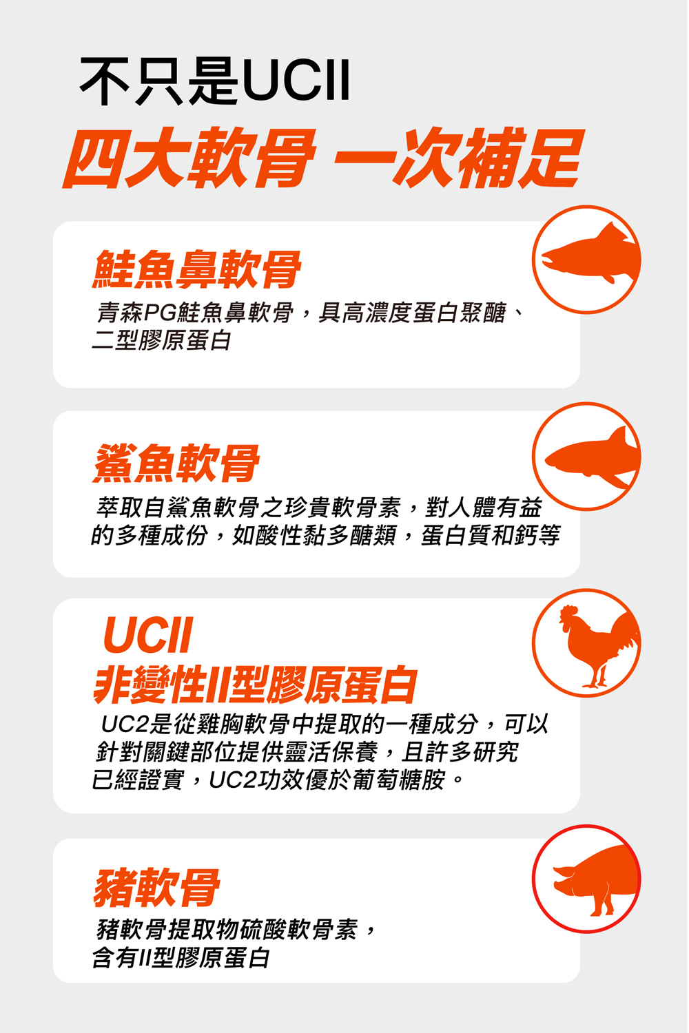 ・不只是非變性二型膠原蛋白,創新成分,維持靈活行動力 ・全方位關鍵行動補給 ・3種型態膠原蛋白,4大軟骨一次補足 ・日本研發製造,原裝進口