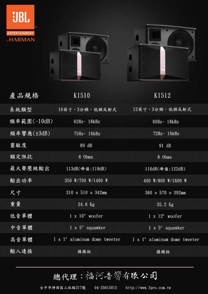 12 吋 3 路全頻揚聲器系統 Ki512 是一款專為 KTV 應用設計的全頻揚聲器。這款三分頻揚聲器由一個12吋低音單體、一個5吋中音單體和一個1吋鋁製球頂高音單體組成,能夠承受400瓦的持續功率。 高功率的12吋低音單體採用長纖維紙漿錐盆和純丁腈橡膠環繞,具有必要的剛度和容量,能夠承受馬達產生的巨大加速力。 5 吋紙盆中音揚聲器和 1 吋鋁製球頂高音揚聲器優化了中高音範圍的再現,並保證了整個揚聲器系統的音質不受影響。 Ki512 具有大膽而獨特的外觀。其不對稱的冷棕色外殼與精心設計的三通系統相呼應。清晰的輪廓顯示了揚聲器的品質和性能。前面板由亮片面料和雪花圖案的格柵組成,並突出了玫瑰金條紋。時尚的外殼營造出優雅和專業的氛圍。 作為 JBL 對技術的執著的展示,JBL ENTERTAINMENT 透過 PSL(被動聲音照明)技術照亮了其標誌。無論您是盡情高歌,還是靜靜地欣賞音樂,您都會用肉眼看到 JBL 的聲音。