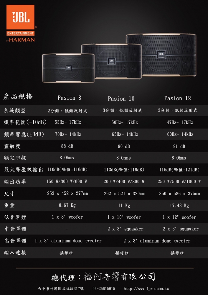 JBL PASION 12 被動 12 吋全頻卡拉 OK 揚聲器 Pasión 系列是 JBL 的下一代卡拉 OK 揚聲器。 Pasión 12 是一款 12 吋被動全頻卡拉 OK 揚聲器,秉承 JBL 的卓越性能,專為商業卡拉 OK 應用的擴聲而設計。作為一款高端 KTV 揚聲器,Pasión 12 延續了 JBL 作為領先卡拉 OK 揚聲器品牌的卓越血統。 Pasión 12 擁有卓越的音質清晰度,是各種卡拉 OK 場所和應用的理想之選。 Pasión 12 採用 JBL 標誌性的卡拉 OK 調音技術,為 KTV 環境提供卓越的人聲和低音表現。此外,該揚聲器配備四個 3 吋高效能高音揚聲器,可提供清晰透亮的高音和中音,而專門設計的 12 吋低音揚聲器則具有高功率處理能力、低失真和最小功率壓縮。 除了無與倫比的音頻性能外,Pasión 12 還擁有精緻時尚的設計。除了時尚的外觀和質感外,這款揚聲器還帶有發光的 JBL Entertainment 標識,方便場地業主展現 JBL 品牌和系統品質。總而言之,JBL Pasión 12 憑藉著卓越的音質和驚豔的視覺效果,提升了 KTV 場所的體驗,為卡拉 OK 愛好者帶來難忘的卡拉 OK 體驗。