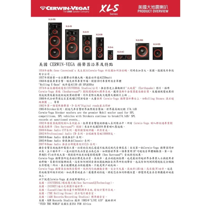 XLS-12S-NA XLS 系列 12 吋家庭劇院主動式重低音喇叭 Cerwin-Vega XLS 系列家庭音響揚聲器與重低音喇叭 – 盡情享受 沒有什麼能比得上現場音樂會的活力與激情,或是電影院音響系統令人心跳加速的震撼。那種震撼人心的震撼力、水晶般清晰的高音以及深沉如雷的低音——這種感覺讓音樂和電影令人難以忘懷。在 Cerwin-Vega!,我們以向世界各地的劇院、現場活動和表演者提供專業級的音響而聞名。現在,我們透過 XLS 系列將相同的傳奇性能帶回家——旨在提供您渴望的力量、精準度和清晰度。 傳奇般的力量,無與倫比的精準度