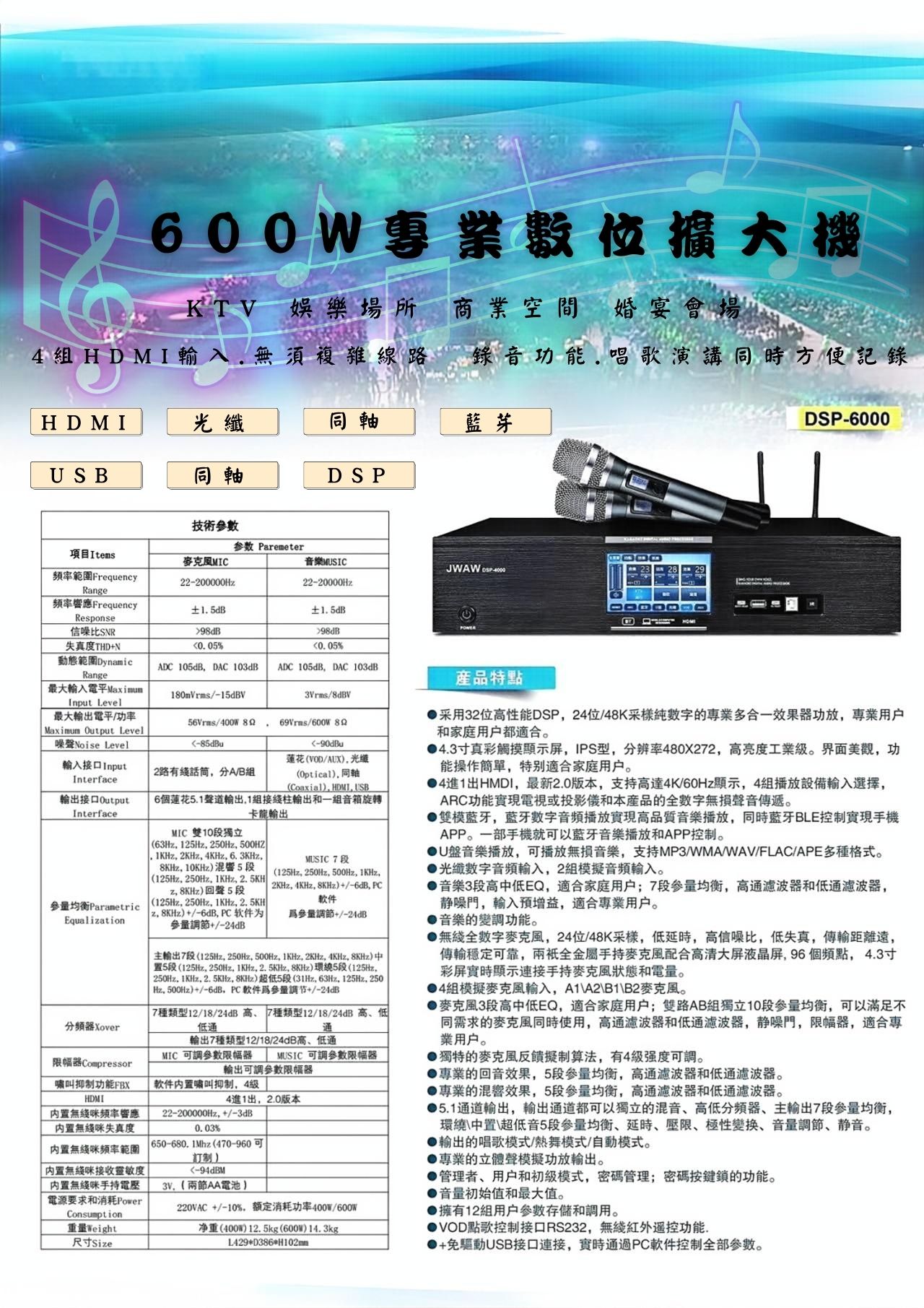 【JJWAW DSP-6000】600W專業數位擴大機(專業麥克風*2支)