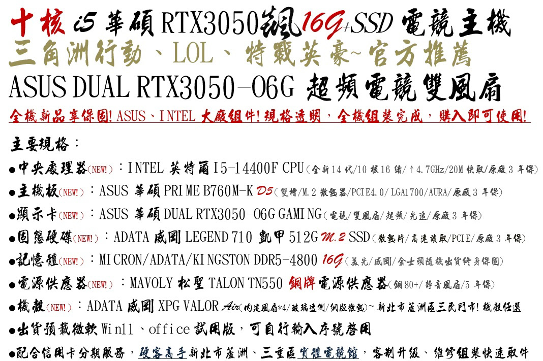 全新十核心 I5/華碩 B760/光追獨顯RTX3050/飇16G/512G SSD