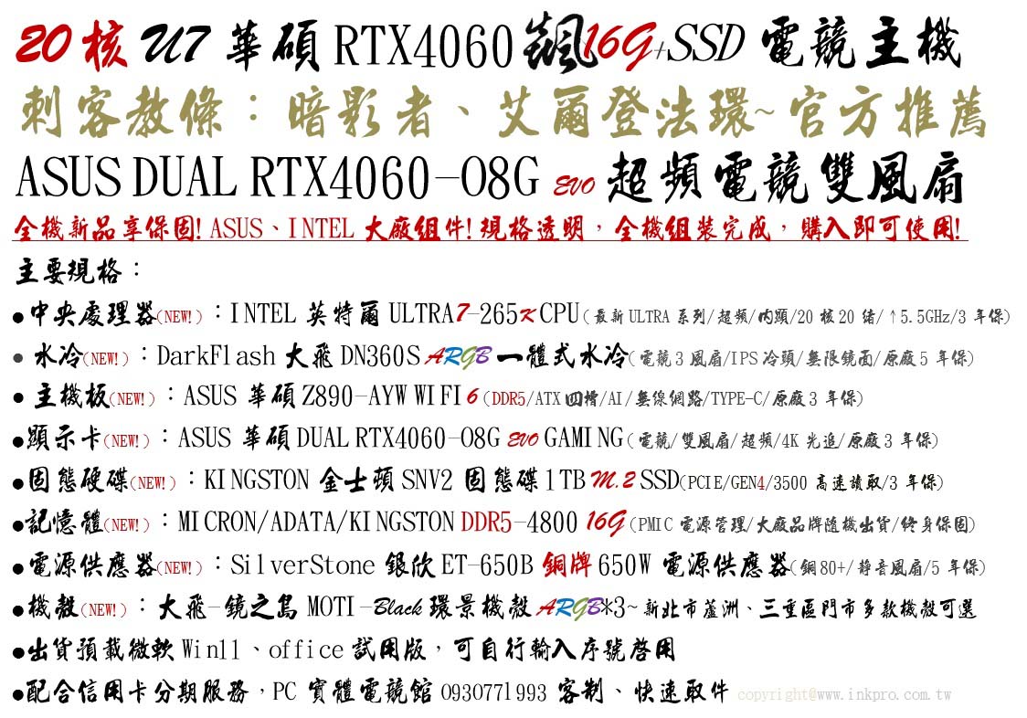 【20核U7華碩RTX4060飇16G+SSD電競主機】