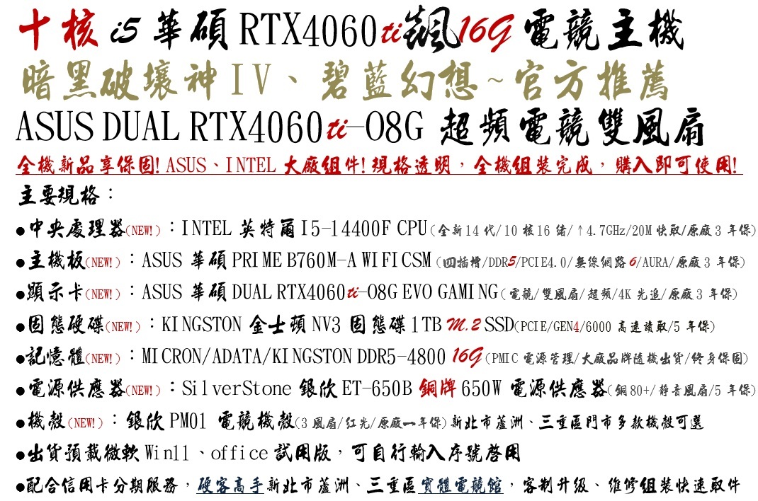 全新14代/華碩 DDR5 WIFI/超頻雙風扇 RTX4060TI/飇16G/電競 1T