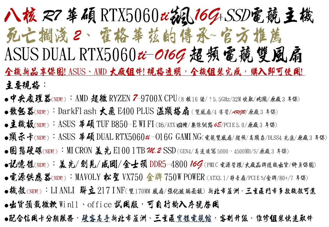 八核R7華碩RTX5060ti飇16G+SSD電競主機