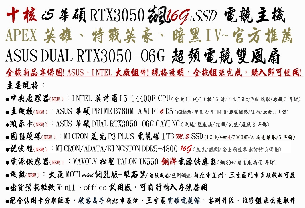 全機新品享保固!ASUS、INTEL大廠組件!規格透明,全機組裝完成,購入即可使用!