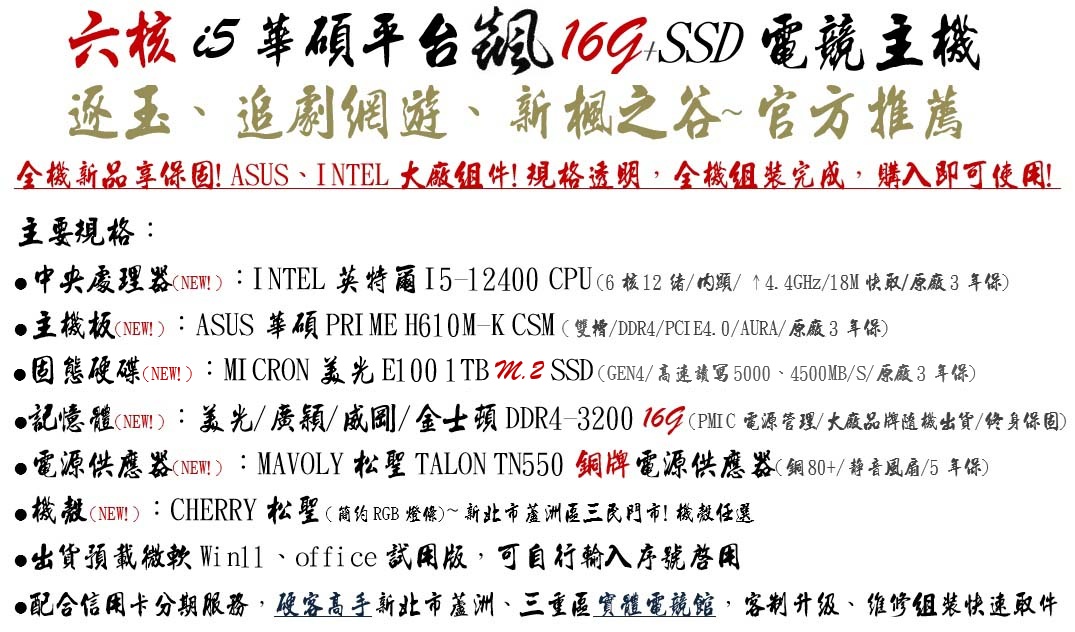 全機新品享保固!ASUS、INTEL大廠組件!規格透明,全機組裝完成,購入即可使用!