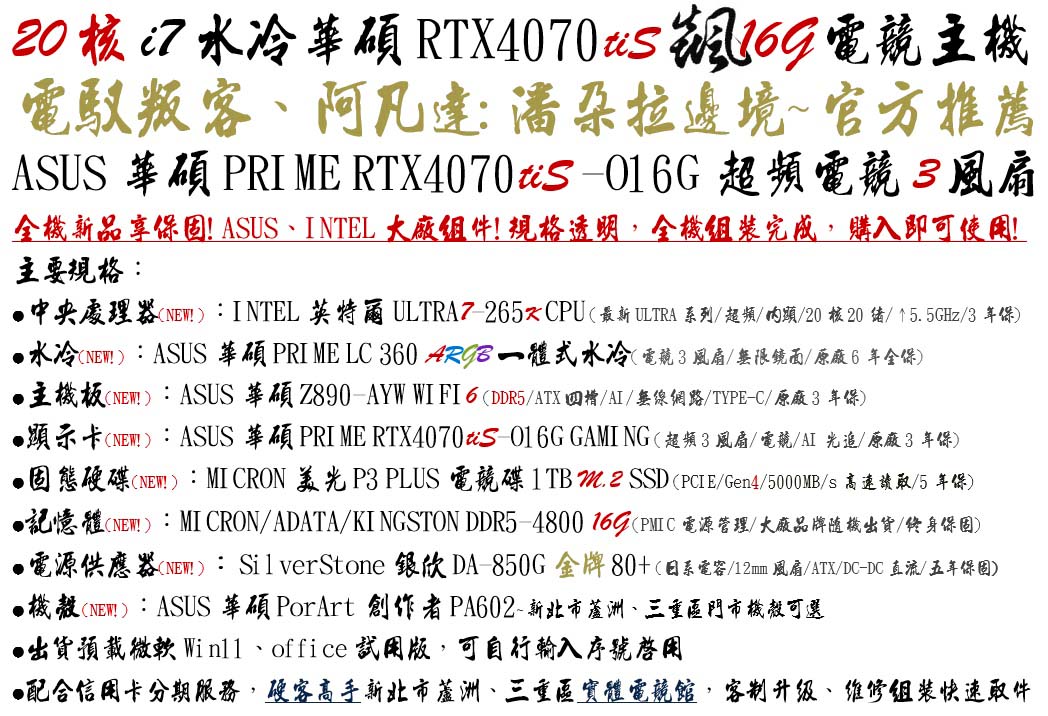 【20核U7水冷華碩RTX4070tiS飇16G電競主機】