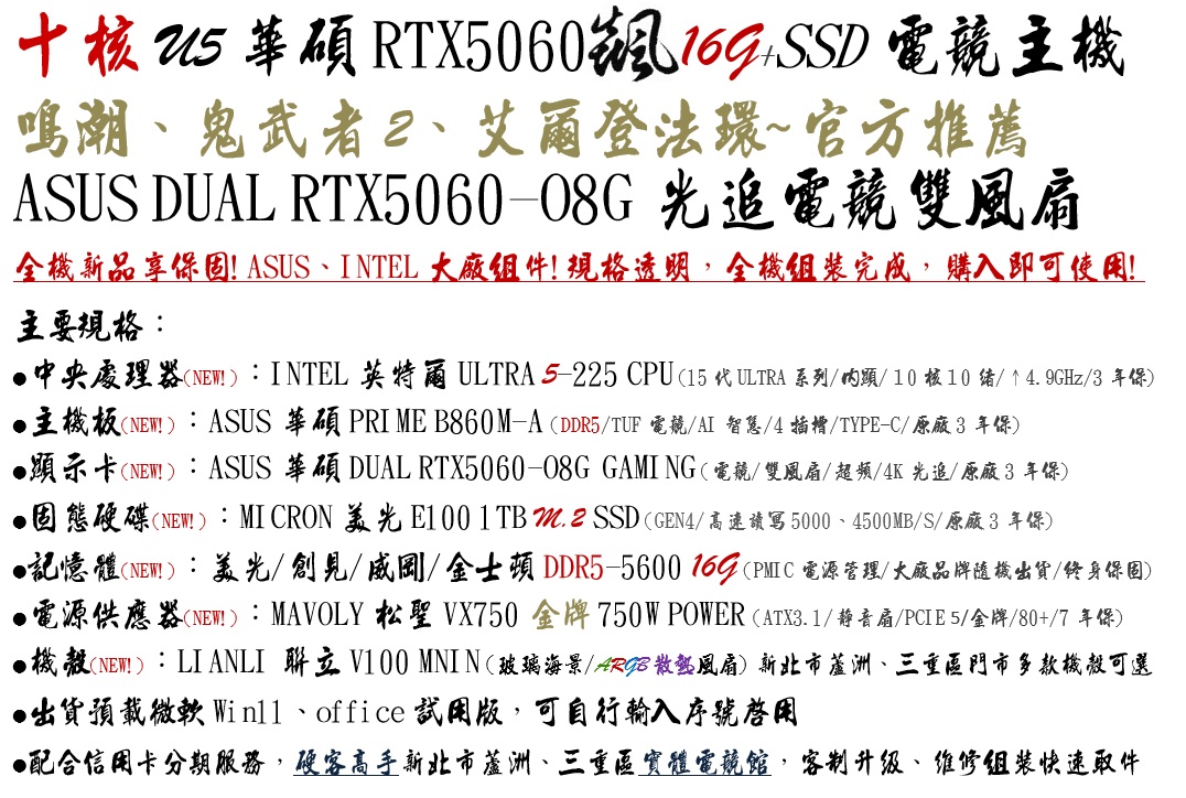十核U5華碩RTX5060飇16G+SSD電競主機