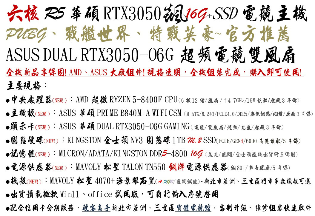六核R5/華碩B840 WIFI/RTX3050雙扇/電競1T/16G
