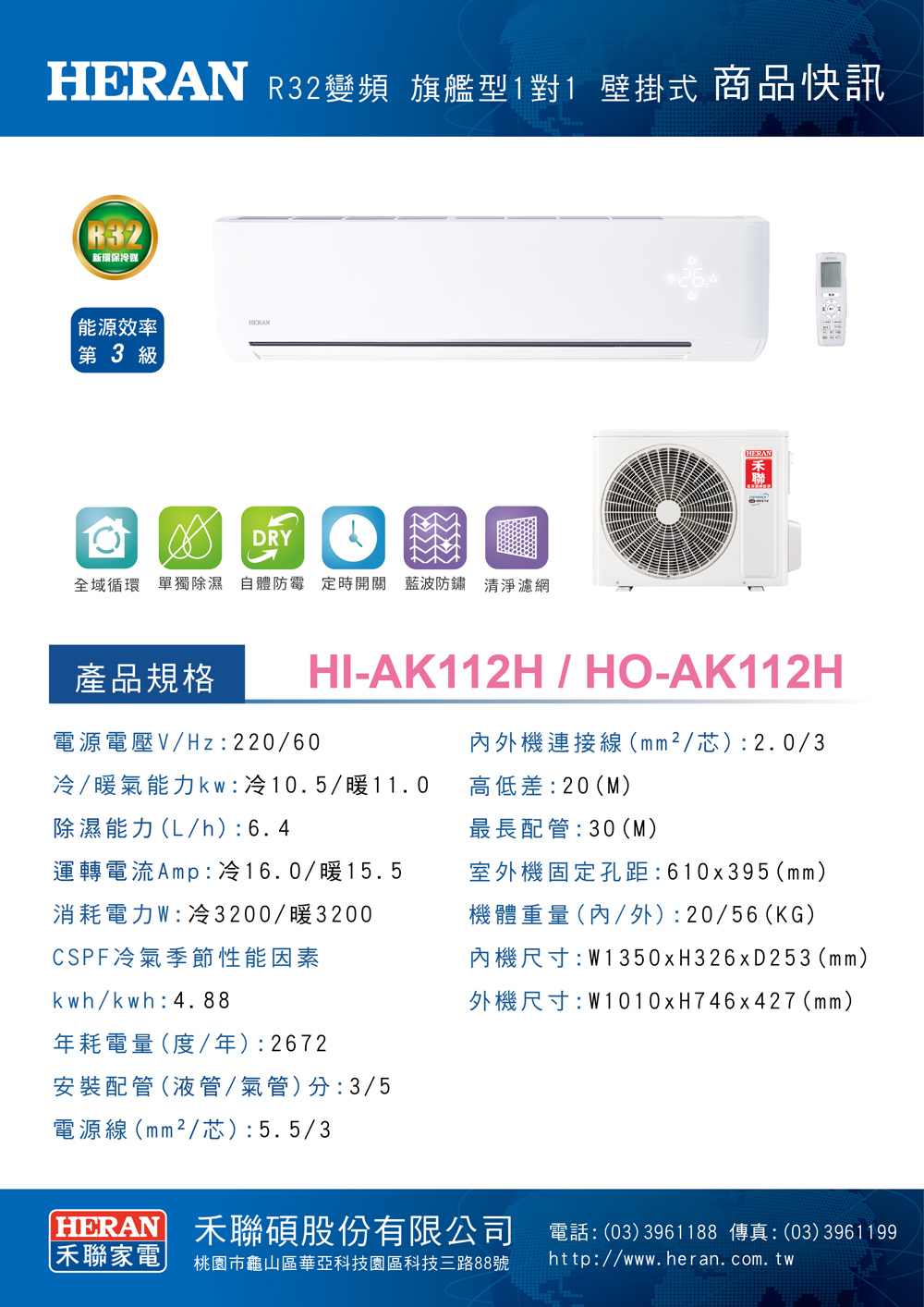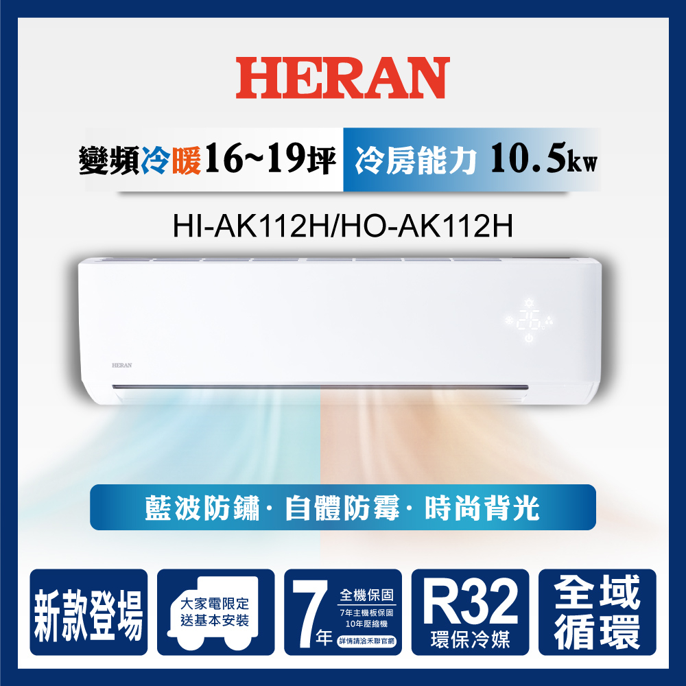 ※保固期:家用空調產品於禾聯碩官網(https://www.heran.com.tw)完成保證書登錄(請於購買日起一個月內完成登錄),即可享有全機保固7年/主機板保固7年/壓縮機保固10年;營業用(泛指非家用)僅全機三年保固。若有其他特殊情況請見產品保證書或撥打免付費客服專線0800-667-999。