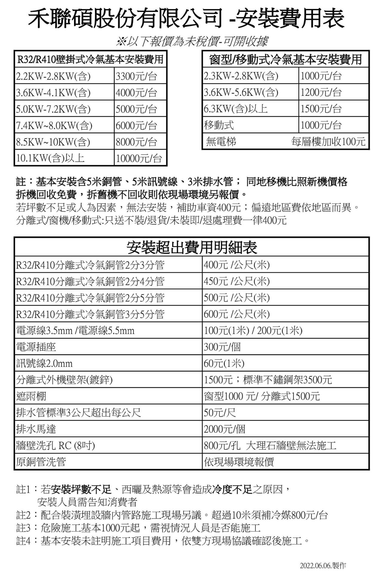 ※ 本商品【含基本安裝服務(含5米銅管,5米訊號線,3米排水管),其他超出管線材依內容表收費】
