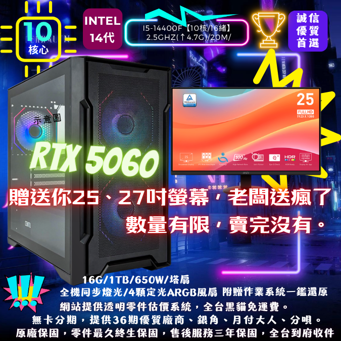 【RTX5060】送螢幕專案(I5-14400F/RTX5060/16G/1T/塔扇)