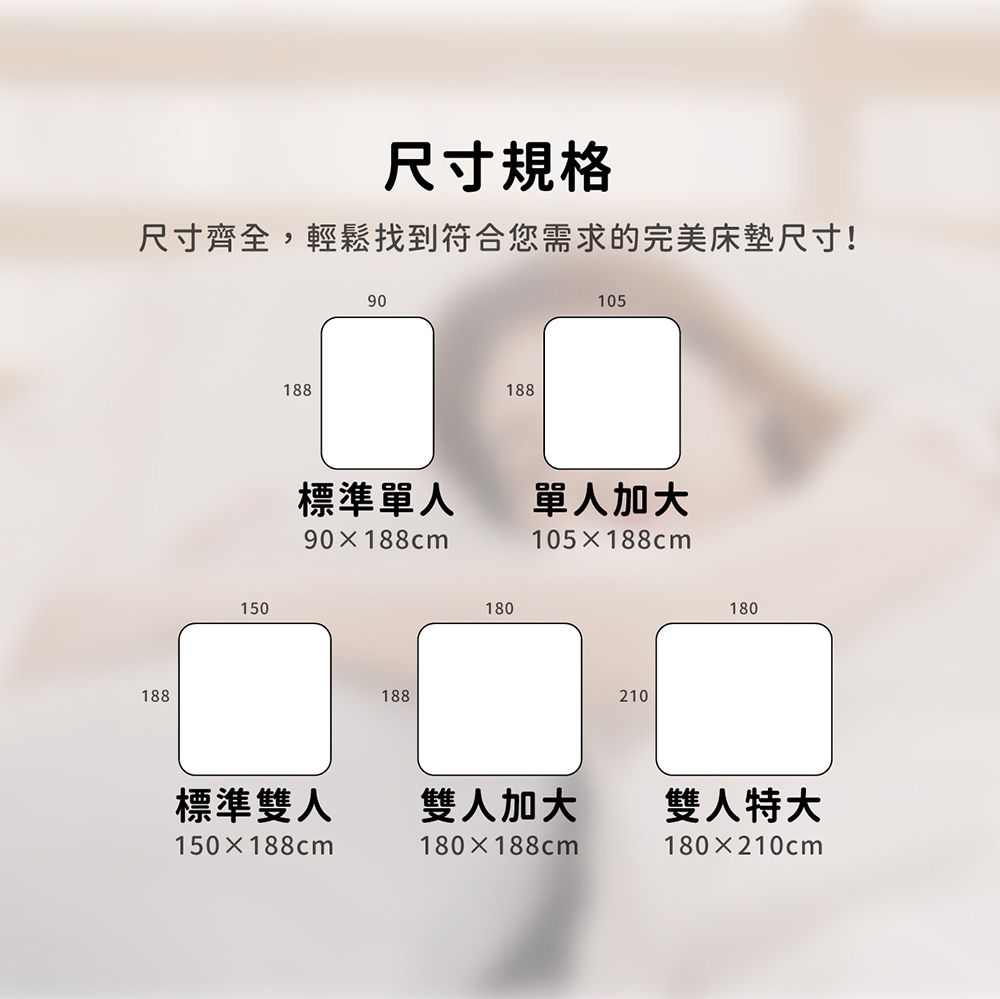 提供 標準單人3尺 至 雙人特大7尺 多種床墊尺寸。