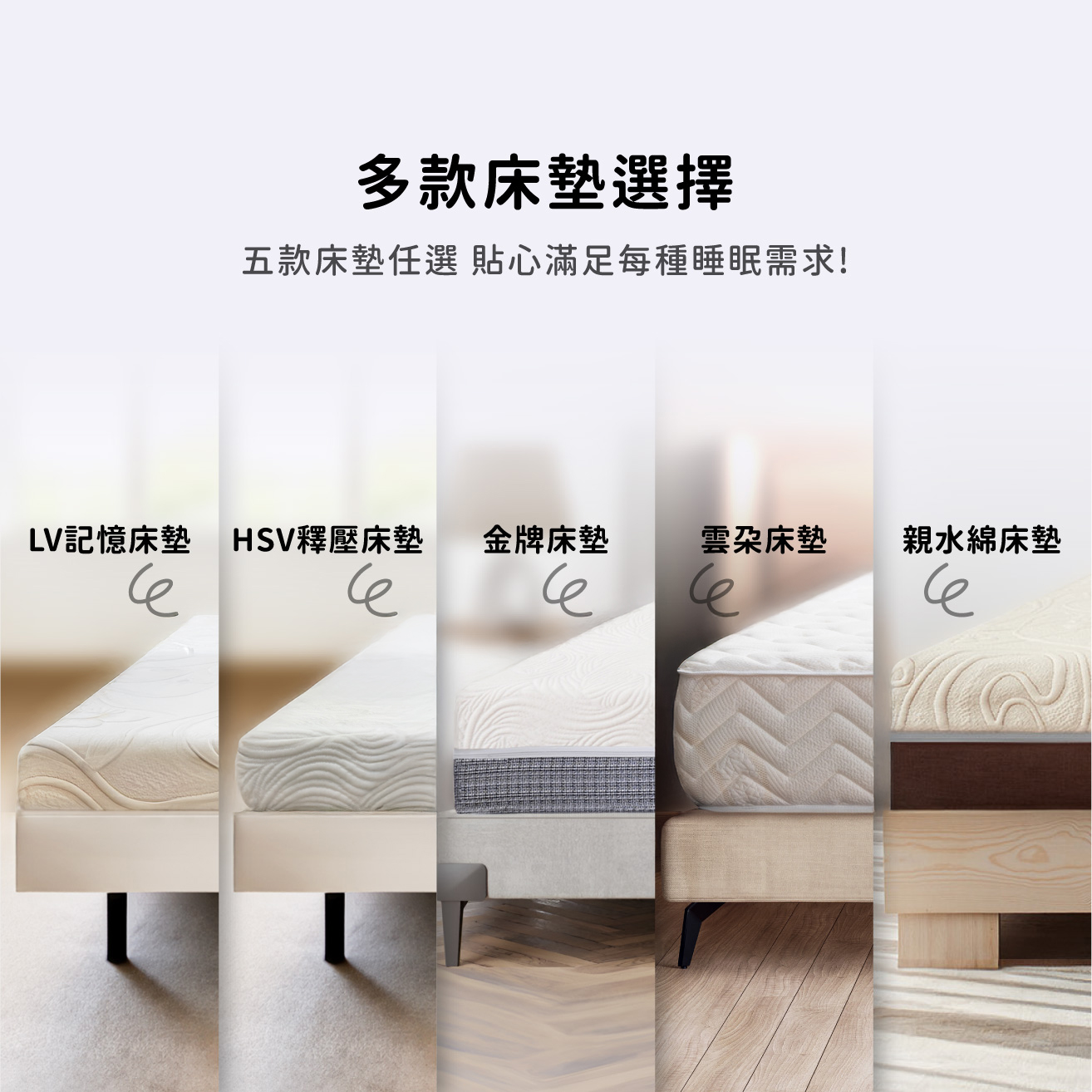 - 五款床墊可搭配,從薄到厚、軟到硬滿足不同睡眠需求