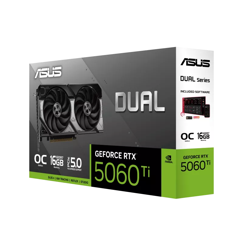 雙倍厲害 完美契合 ASUS Dual GeForce RTX™ 5060 Ti 結合強大散熱效能與廣泛相容性。承襲旗艦顯示卡的先進散熱技術,包括兩個軸向式風扇,有效提升氣流導向散熱器。精心設計的 2.5-slot 緊湊外型,於有限空間中提供強大效能。這些升級使 ASUS Dual 成為追求高效圖形表現又想打造精巧主機的玩家理想選擇。
