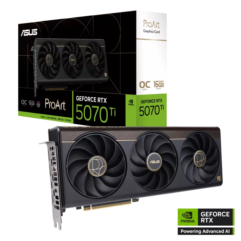 ProArt GeForce RTX™ 5070 Ti OC 超頻版 全面駕馭 創享無限 ProArt GeForce RTX™ 5070 Ti 結合了精巧的 2.5 slot 設計與強大的散熱系統——包括三組軸向式風扇、均溫熱導板以及相變 GPU 散熱片——為全尺寸直立式機殼和節省空間的 SFF 組裝電腦,提供 GeForce RTX 50 系列的卓越效能。USB Type-C® 連接埠為內容創作工作流程提升了多功能性,而木紋層壓飾邊和低調的 Aura 發光標誌則有助於呈現精緻的美感。