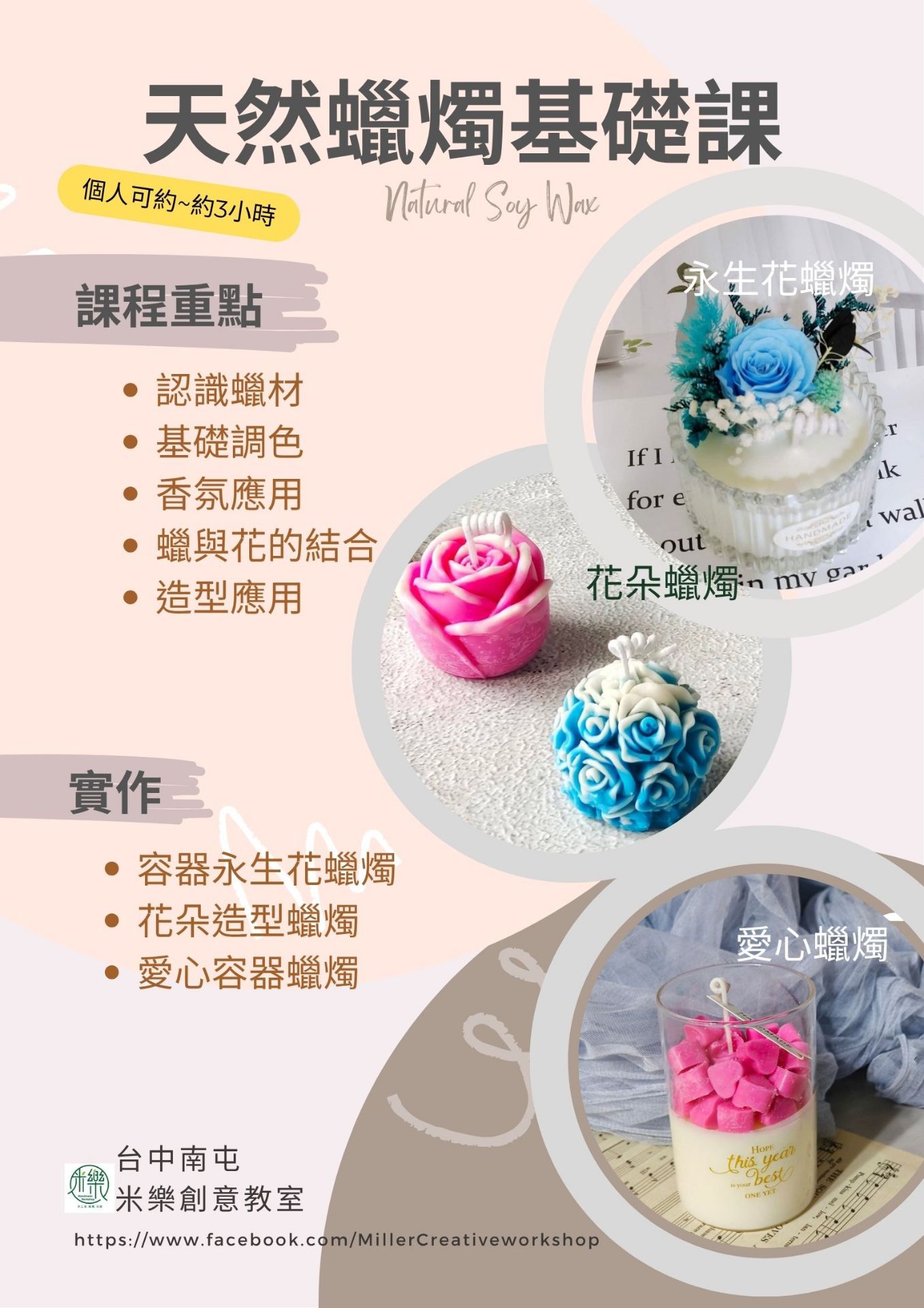 一次學會三款夢幻蠟燭!課程包含:永生花蠟燭、花朵造型蠟燭與愛心蠟燭,皆使用天然大豆蠟製作,環保又安全。透過香氣與造型的創作,體驗療癒的手作過程。單堂練功即可完成三款作品,最適合蠟燭入門者體驗,親手打造專屬於自己的溫暖光芒。