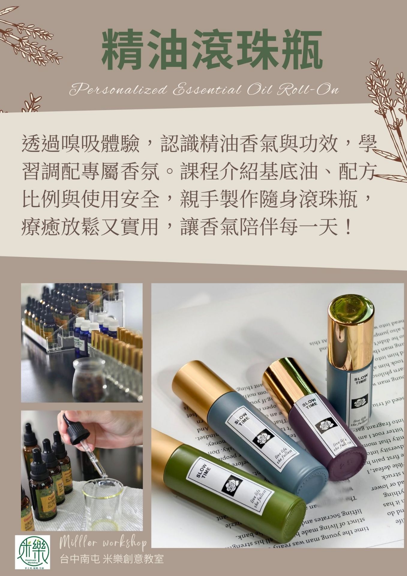 透過嗅吸體驗,認識各類精油的香氣特質與功效,學習如何依情緒與需求調配專屬香氛。課程中將介紹精油基底、配方比例與使用安全,並親手製作實用的隨身滾珠瓶,讓療癒香氣伴你左右,隨時舒緩放鬆、提升能量,開啟每日好心情!