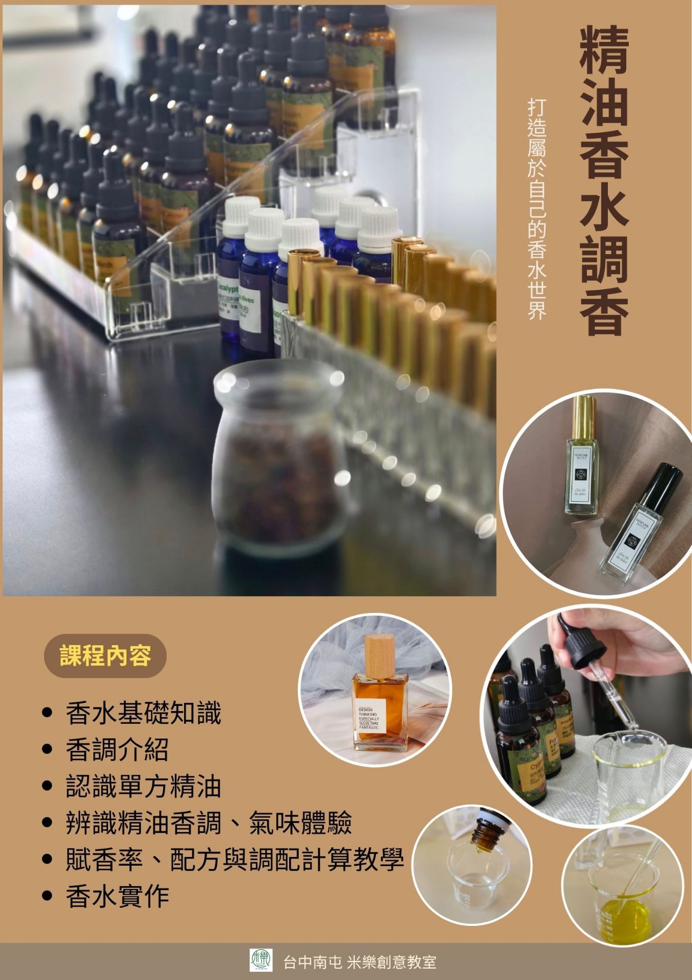 【精油香水調香課】 走進香氣的奇幻世界,學習香水的基本知識與精油香調的分類。課程中透過氣味體驗與嗅吸練習,感受前、中、後調的迷人變化,並掌握調香比例與層次技巧。親手打造屬於自己的專屬香氛,展現獨特氣質與風格,讓生活增添一份優雅而療癒的香氛儀式感。