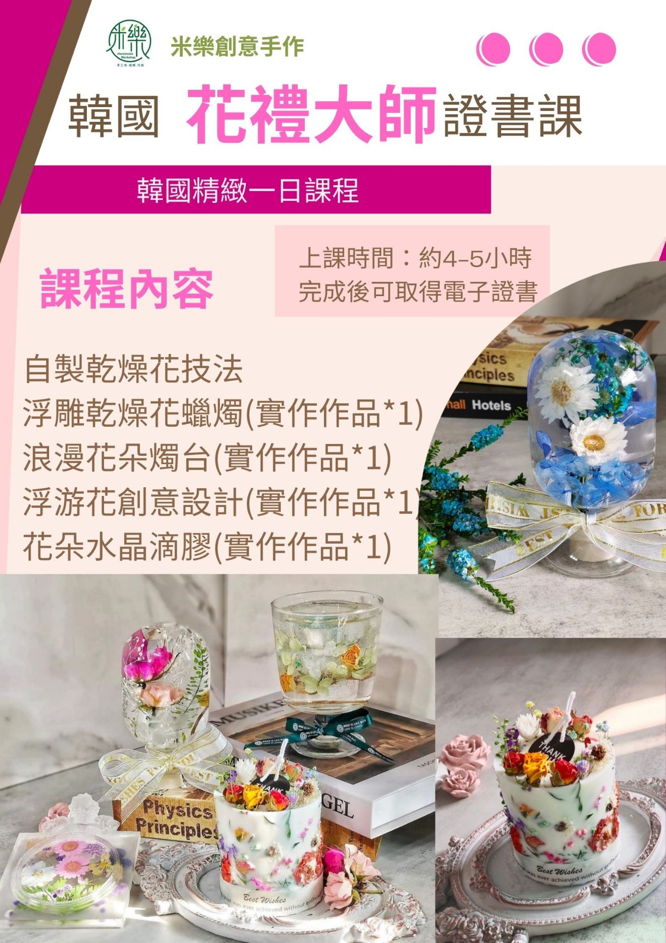 花兒給人的感覺總是充滿幸福與浪漫,這系列課程設計,讓你掌握多種花禮物的技能應用,還能習得自製花材並將新鮮的花朵,製作成漂亮的乾燥花,讓花兒帶給自己與身邊的人都幸福快樂呦。