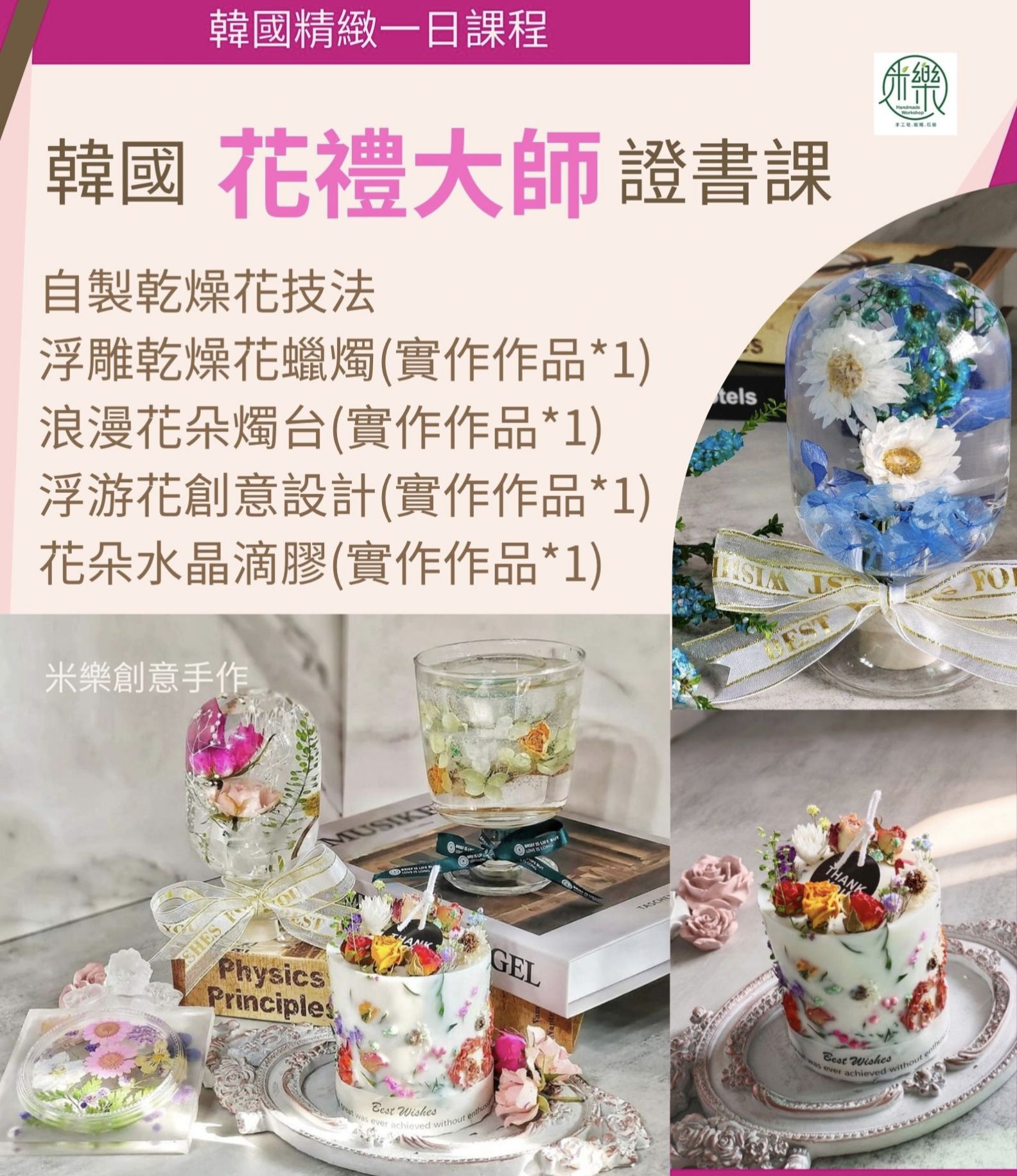 韓國花禮物設計大師證照課程BDRA bouquet gift master class 花兒給人的感覺總是充滿幸福與浪漫,這系列課程設計,讓你掌握多種花禮物的技能應用,還能習得自製花材並將新鮮的花朵,製作成漂亮的乾燥花,讓花兒帶給自己與身邊的人都幸福快樂呦。