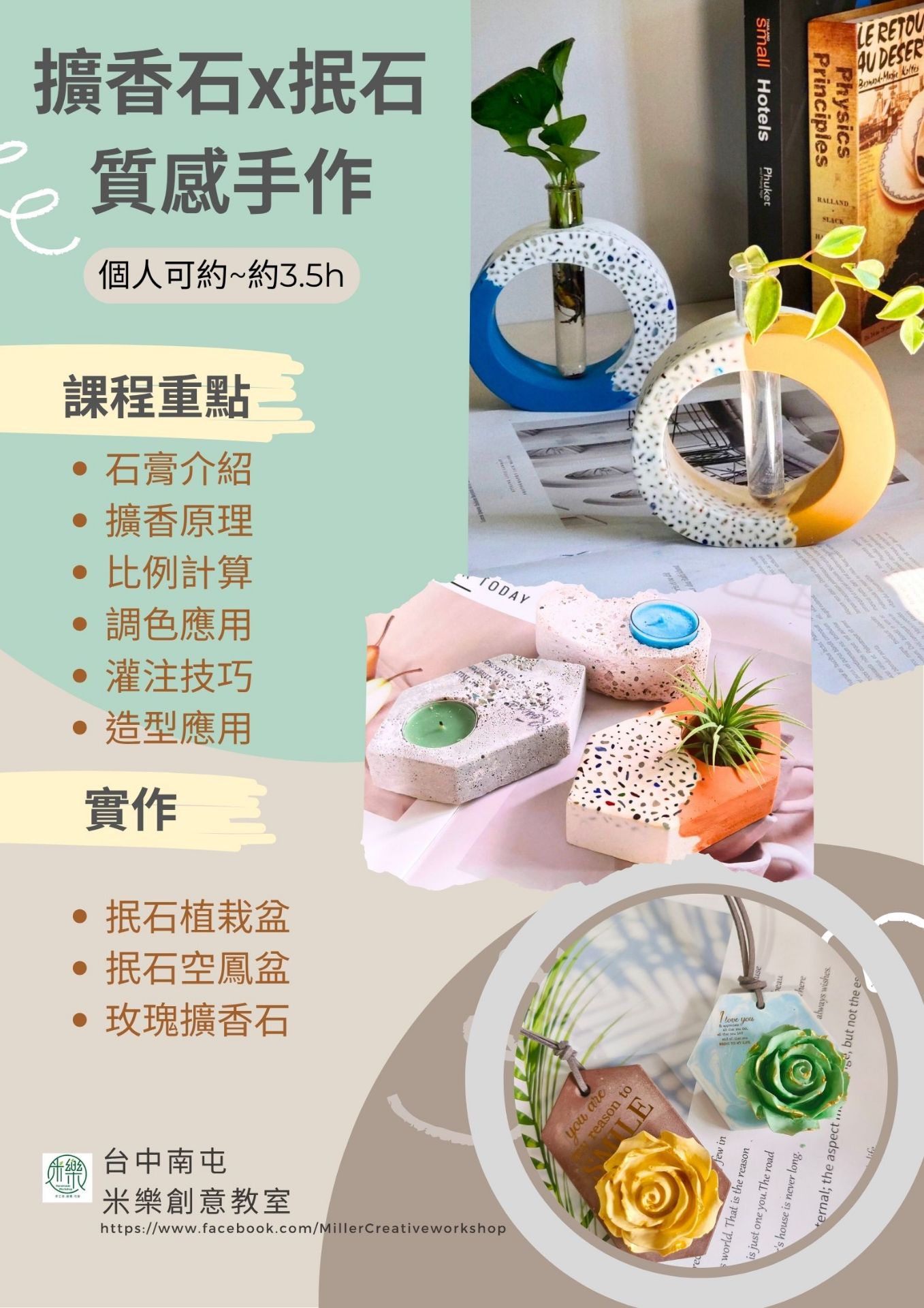 結合擴香石的香氛魅力與抿石的溫潤質感,創造獨一無二的藝術作品!課程中將學習兩種技法的融合應用,體驗調色、拼石與造型設計的樂趣。透過雙重手作過程,打造兼具視覺美感與香氣療癒的生活擺飾,讓空間散發專屬於你的質感氣息。
