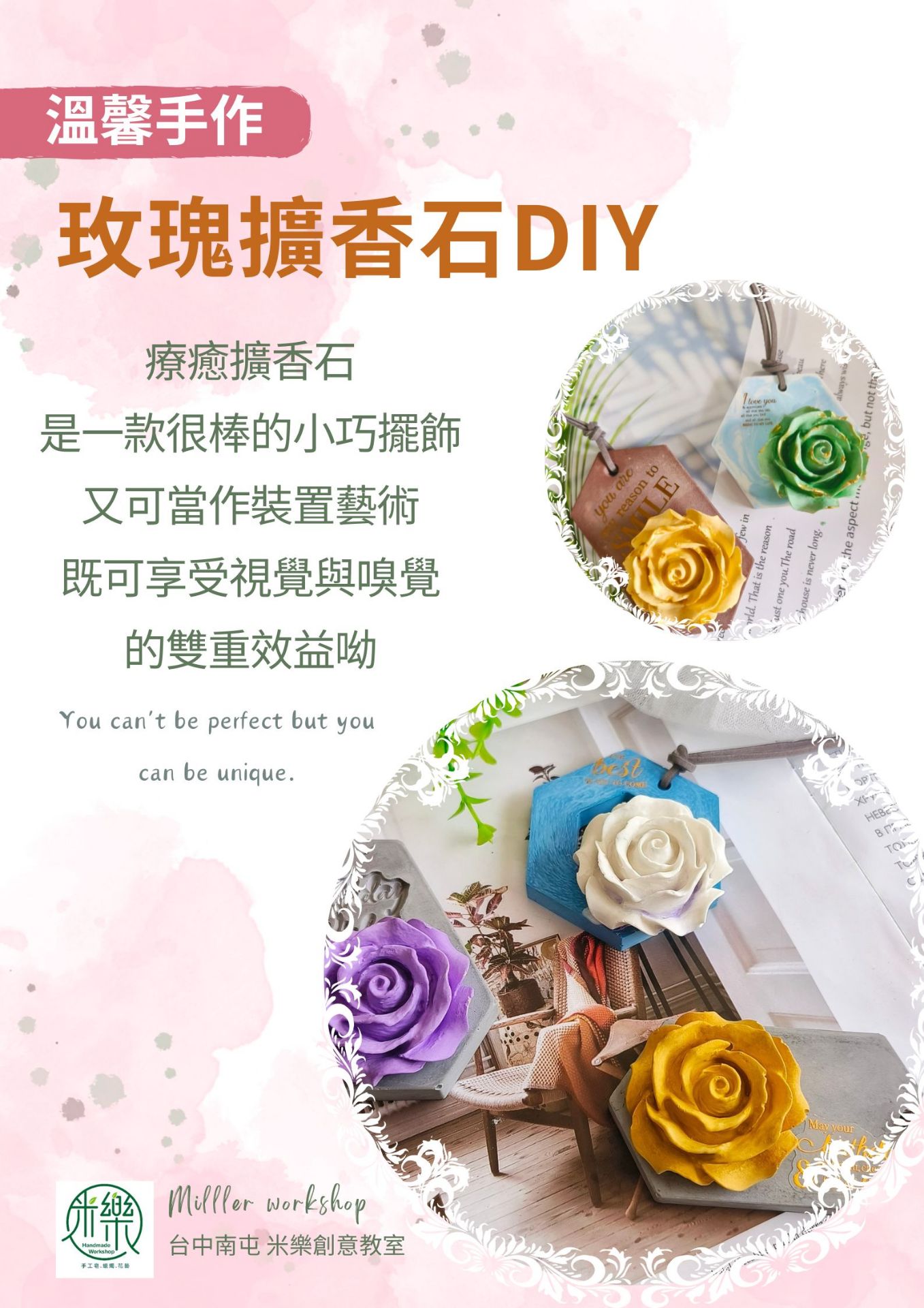 親手打造優雅浪漫的玫瑰擴香石,結合香氛與美學,為生活增添幸福氣息。課程中將學習石膏調製與造型技巧,作品可作為居家香氛裝飾或送禮小物,療癒又實用,讓香氣綻放如花。