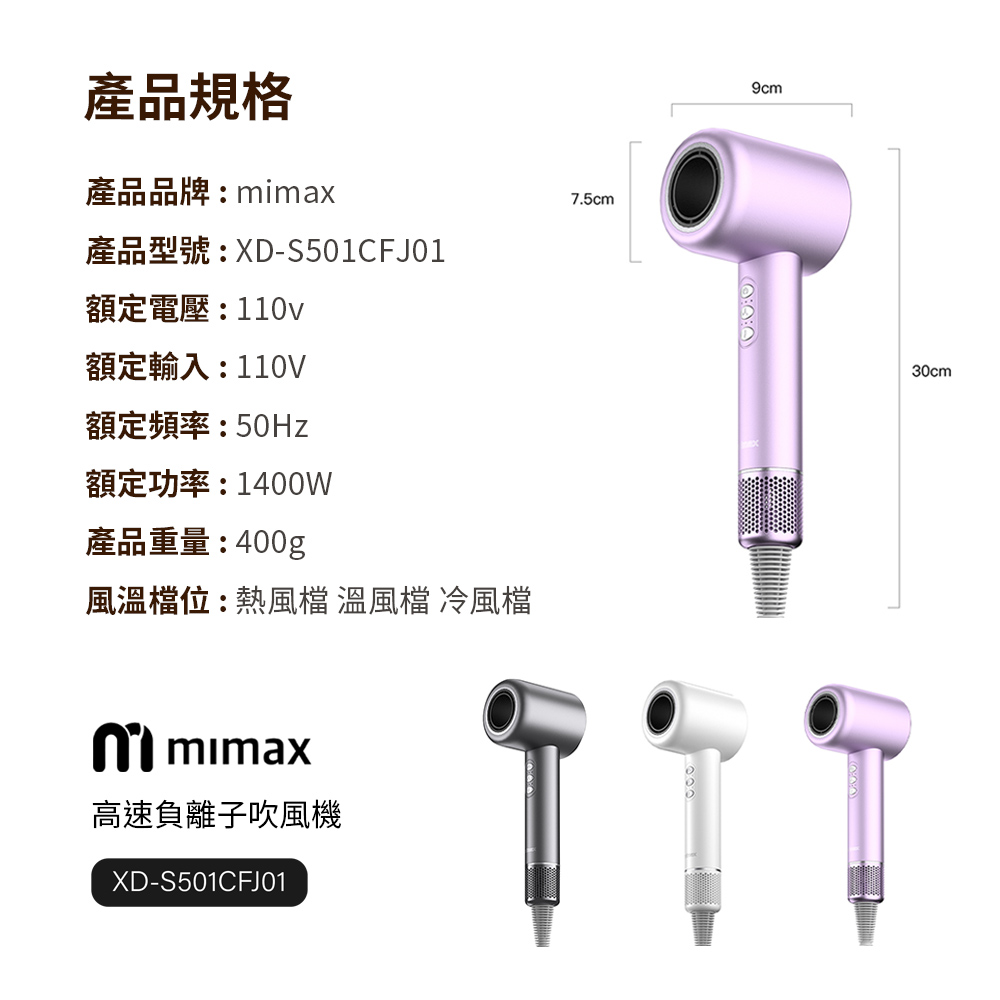 🔹名稱 : mimax米覓 高速負離子吹風機 S501
