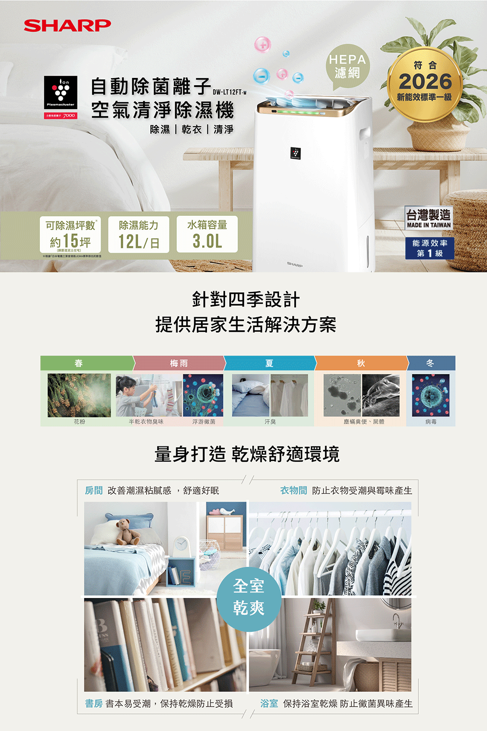 SHARP 夏普12公升 自動除菌離子2合1空氣清淨除濕機 DW-LT12FT-W 量身打造 乾燥舒適環境 觸控面板 操作便利 多項自動感應偵測
