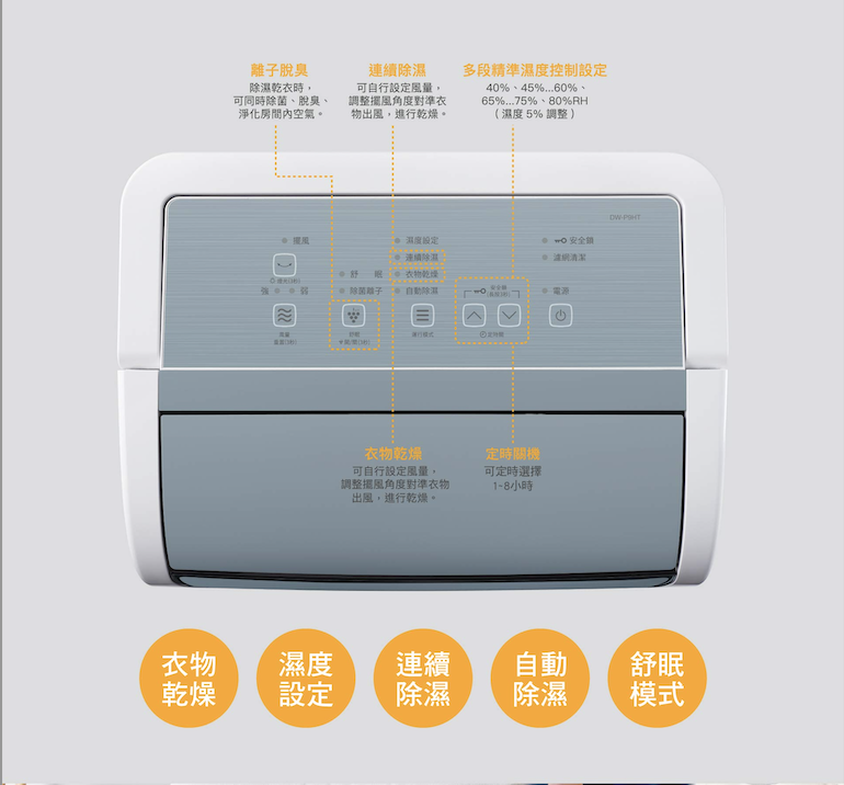 SHARP 夏普8.5公升 自動除菌離子衣物乾燥除濕機(DW-P9HT-W) 濕度感知燈號(5段濕度) 高密度前置過濾網,有效過濾灰塵及毛絮 連續排水/自動除霜/滿水自動護功能