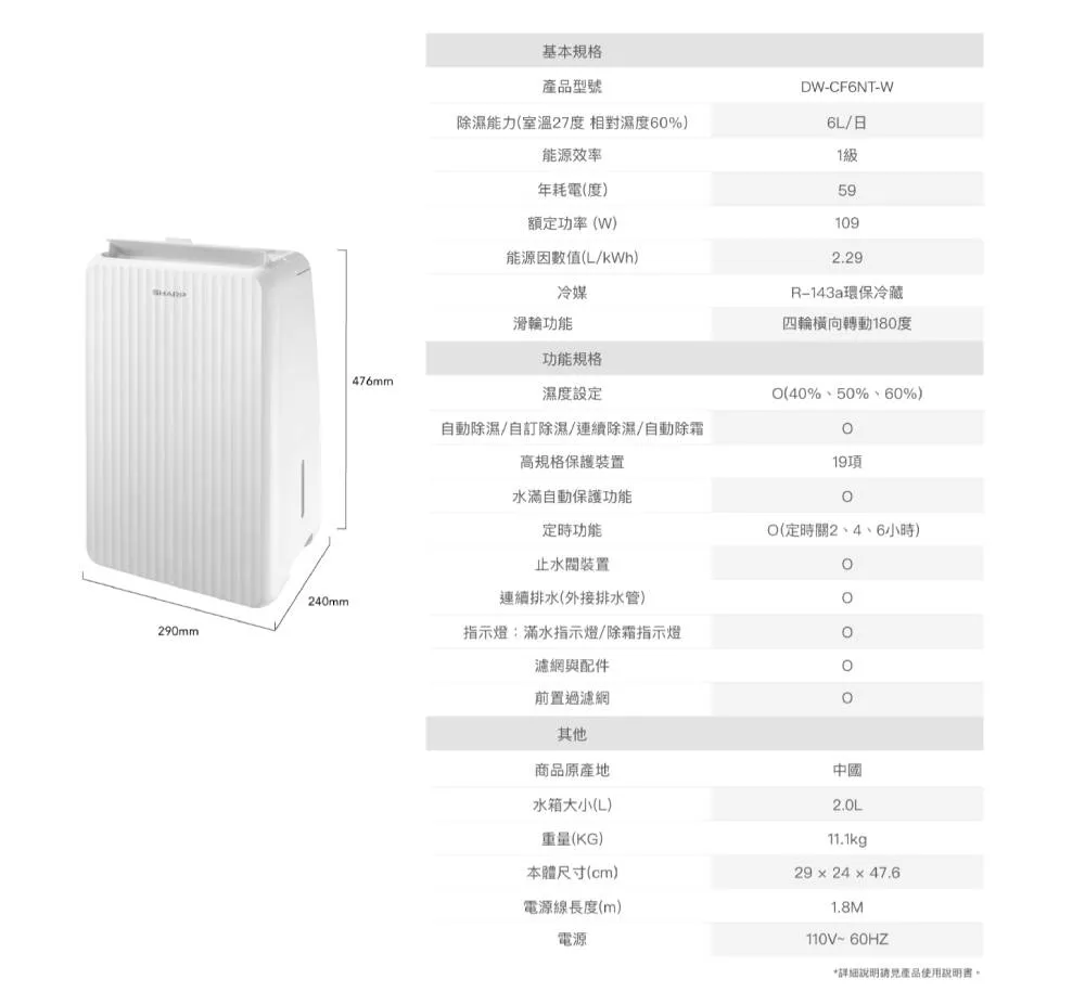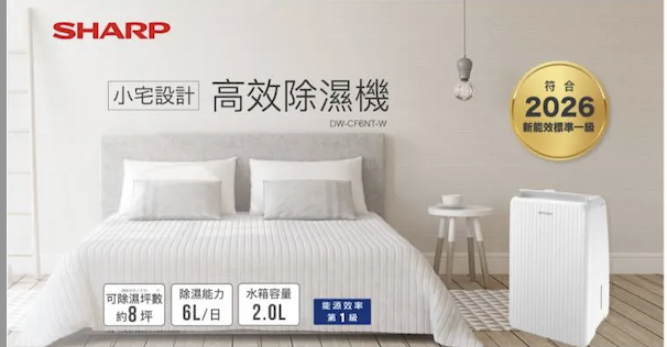 SHARP 夏普DW-CF6NT-W 除濕機 6公升 強效除濕機 一級能效 除濕能力6L/日(B式/室溫27 ℃/相對濕度60%) 搭載溫濕度感應器自動偵測除濕 濕度設定模式(40%/50%/60%/連續) 定時關:2/4/6小時 自動除霜/滿水自動保護功能